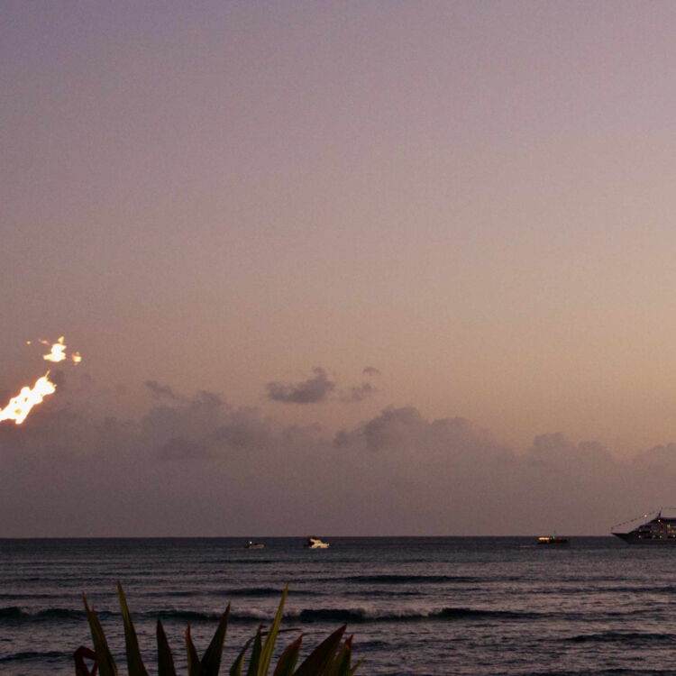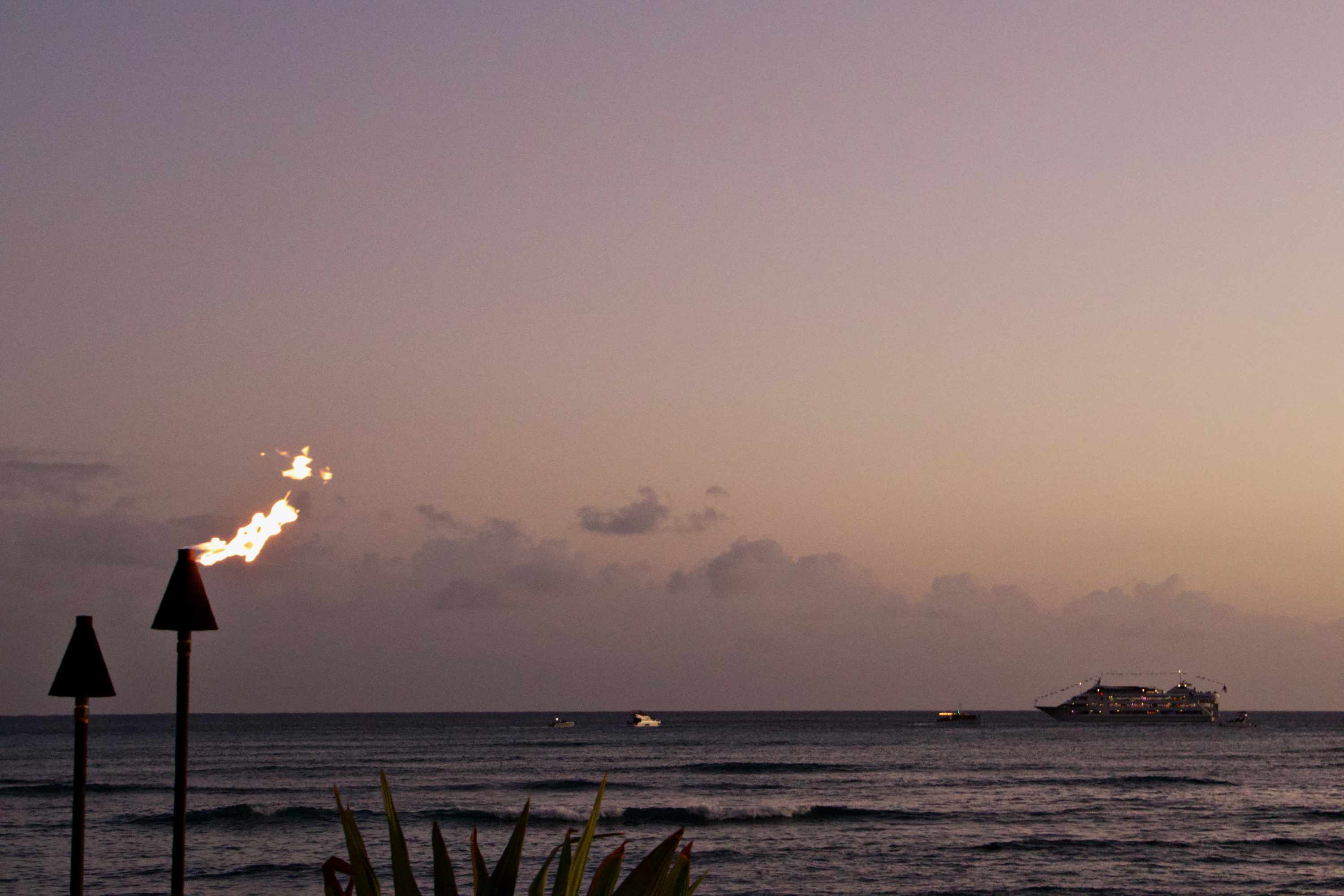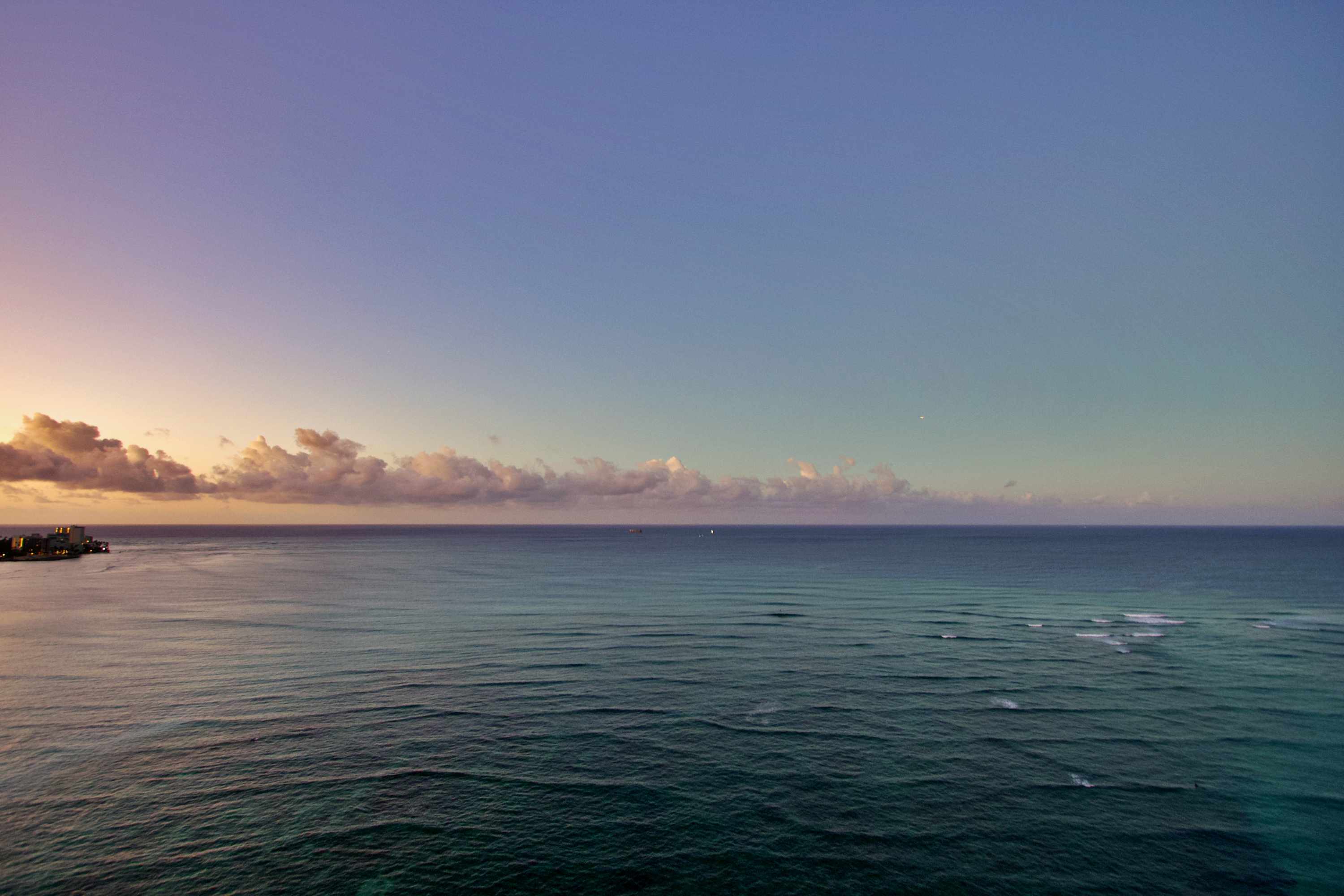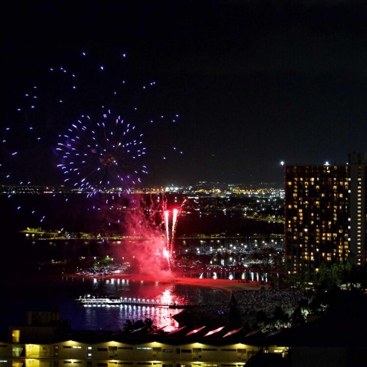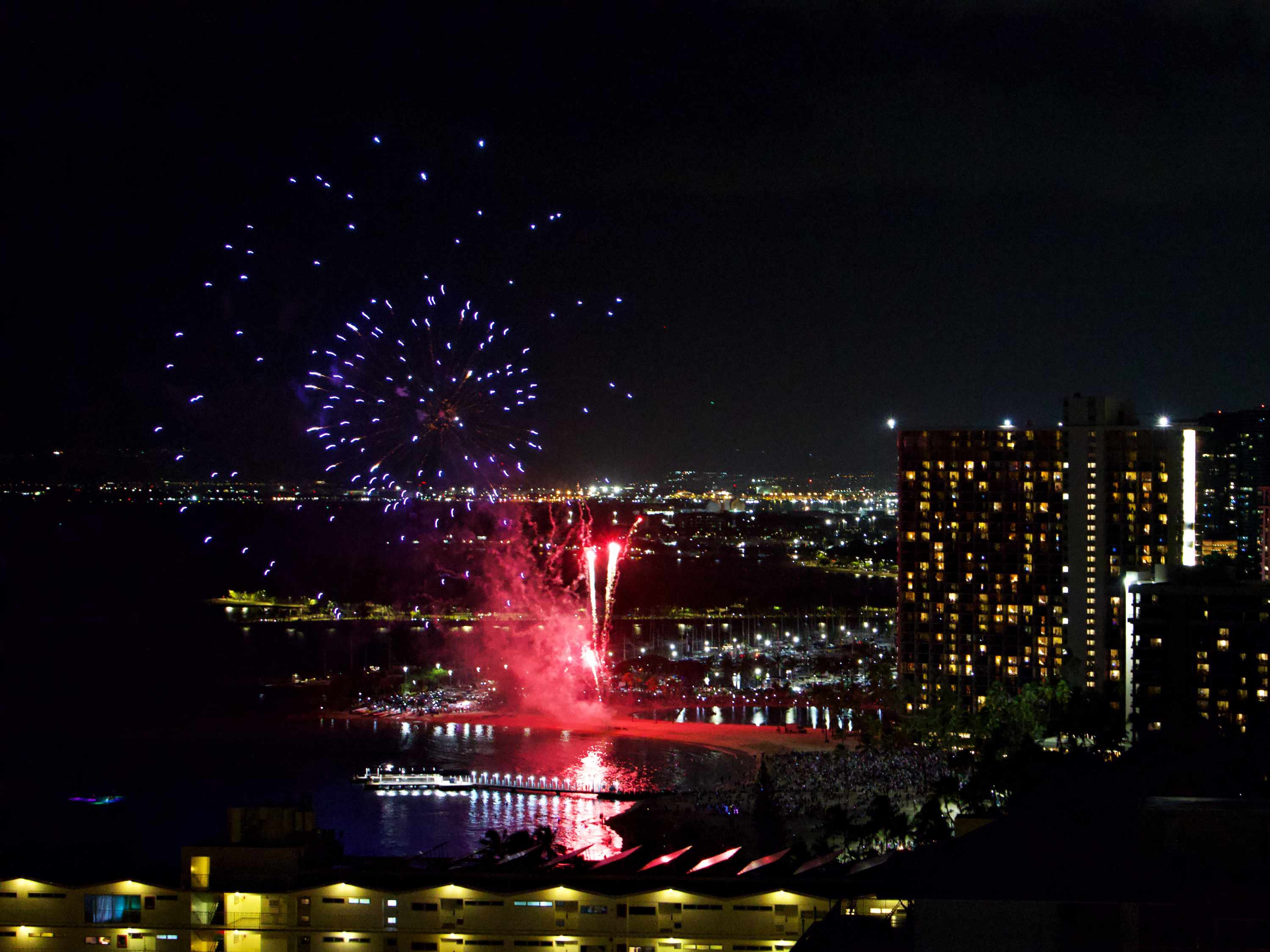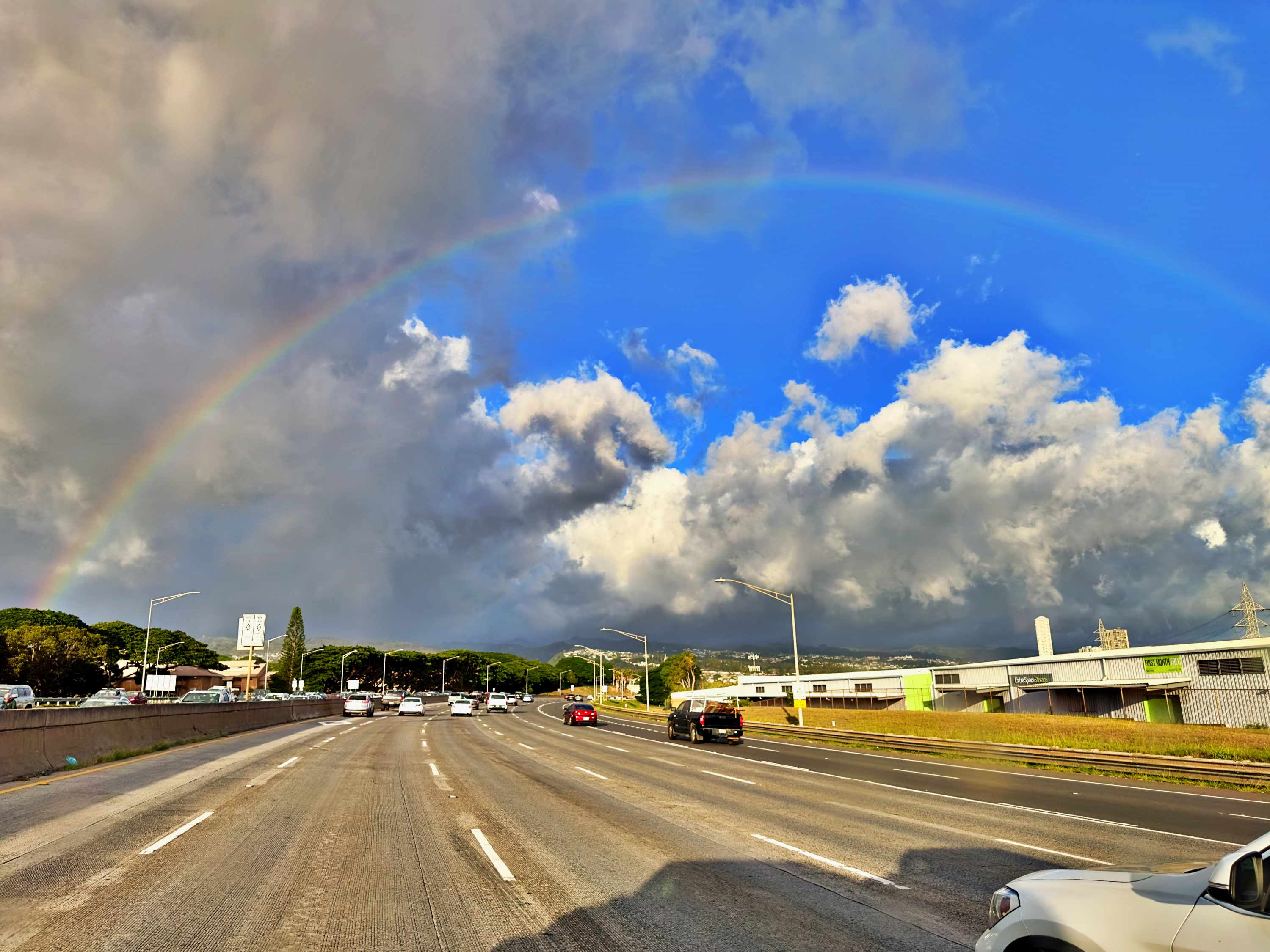 Bei der Fahrt zurück nach Honolulu empfängt uns ein Regenbogen, der sich wie eine riesige Eingangspforte über die Stadt gelegt hat. Der Sonnenuntergang später am Abend ist wie immer zu schön, um wahr zu sein. Als es dunkel wird, bricht in Hafennähe plötzlich ein Feuerwerk los. Es kracht und blitzt und glitzert im Angesicht der hellerleuchteten Skyline Honolulus. So wie wir schaut sich auch der volle Mond das Spektakel an. Als Ruhe einkehrt, übernimmt er wieder die Nachtwache und wirft seinen hellen Schein auf den Pazifik.