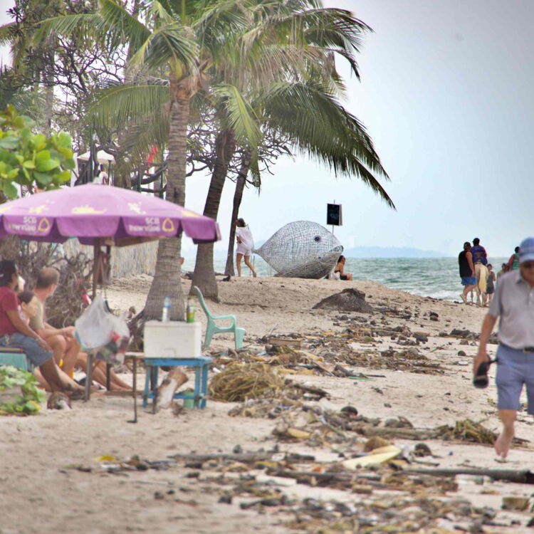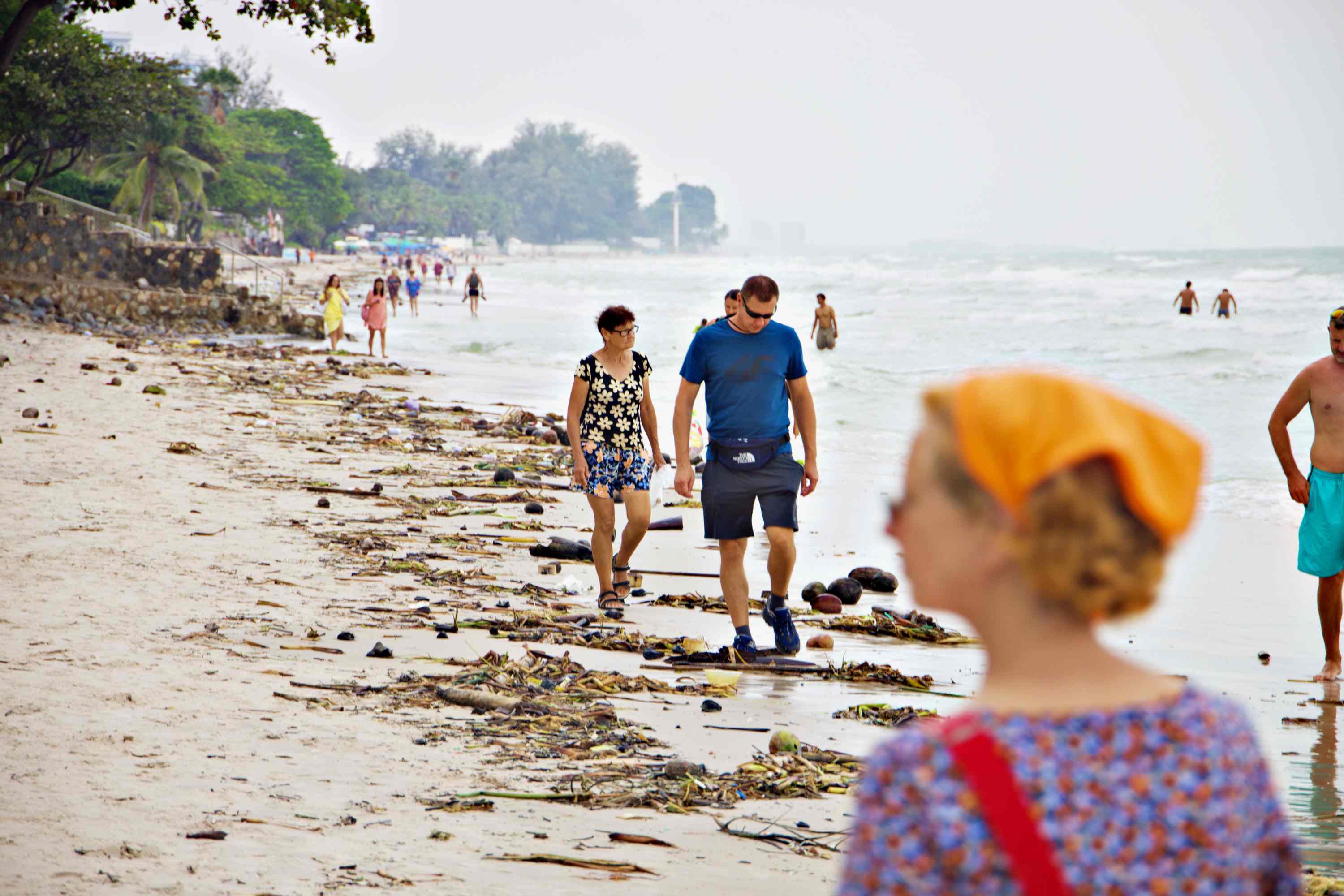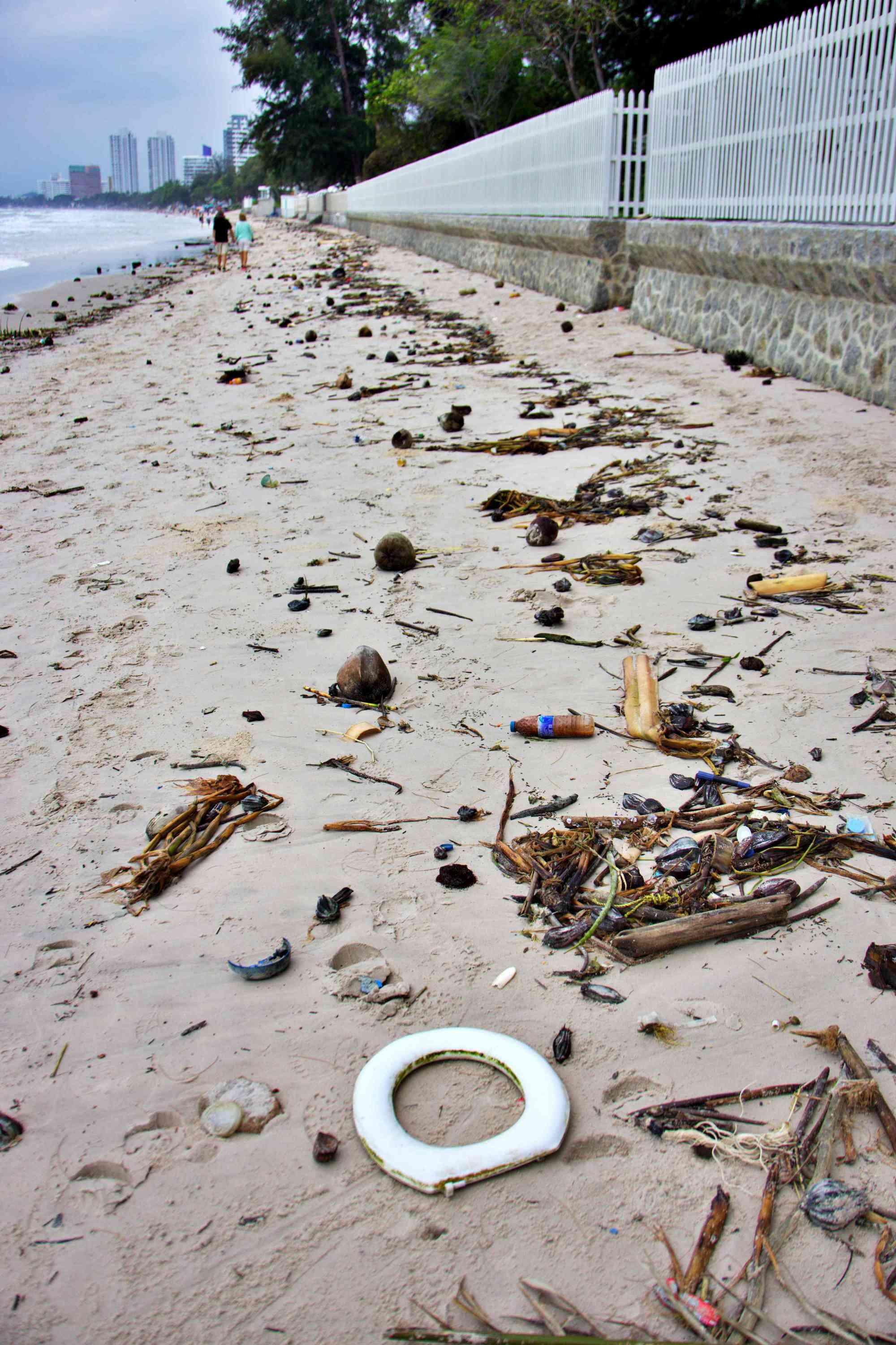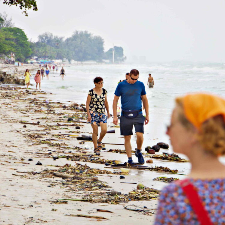 Die Schuhe bleiben an den Füssen. Sie schützen vor Glassplittern und scharfkantigem Plastik. Wir wandern fünf Kilometer vorbei an natürlichem Treibgut und menschengemachtem Müll. Dazwischen erkennen wir hin und wieder auch Sand. Das Navi auf dem Handy bestätigt: wir sind noch immer am Traumstrand von Hua Hin. In anderthalb Stunden hätten wir ein 200-teiliges Besteck aus Plastik und den Tagesbedarf an Plastikstrohhalmen für alle Berliner Barbetriebe aufsammeln können. Neben all dem anderen Hausrat, den das Meer anschwemmt.
