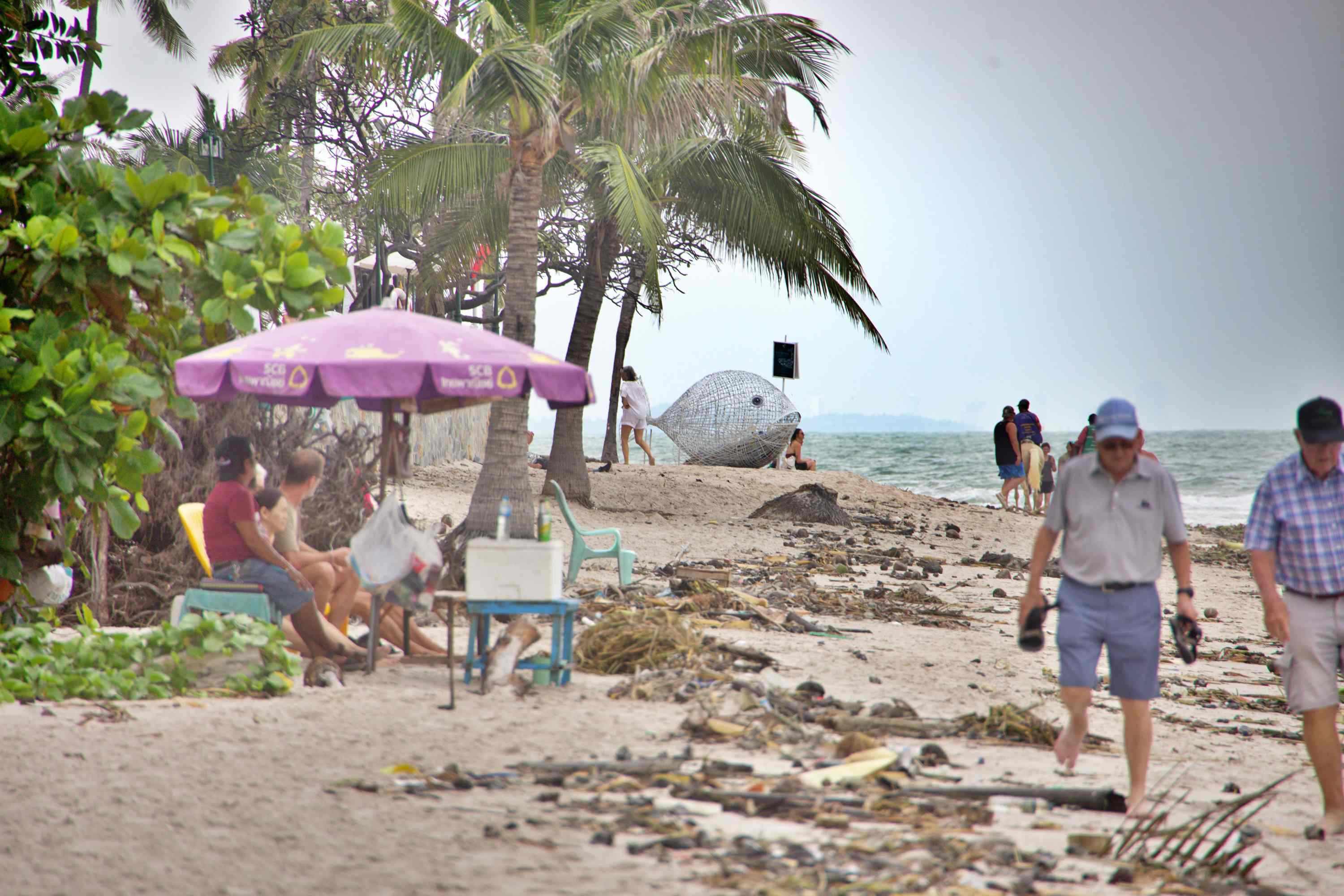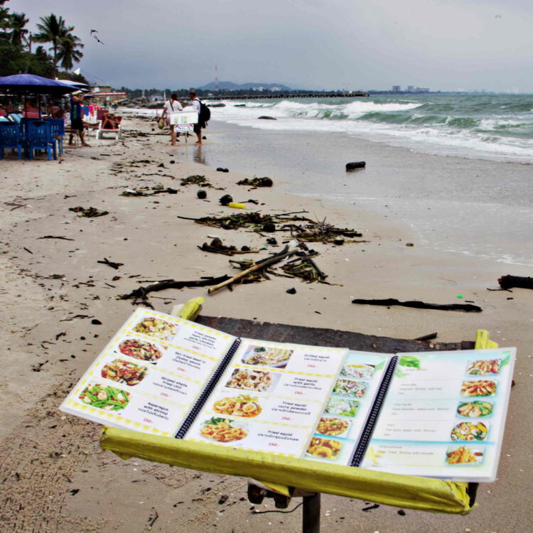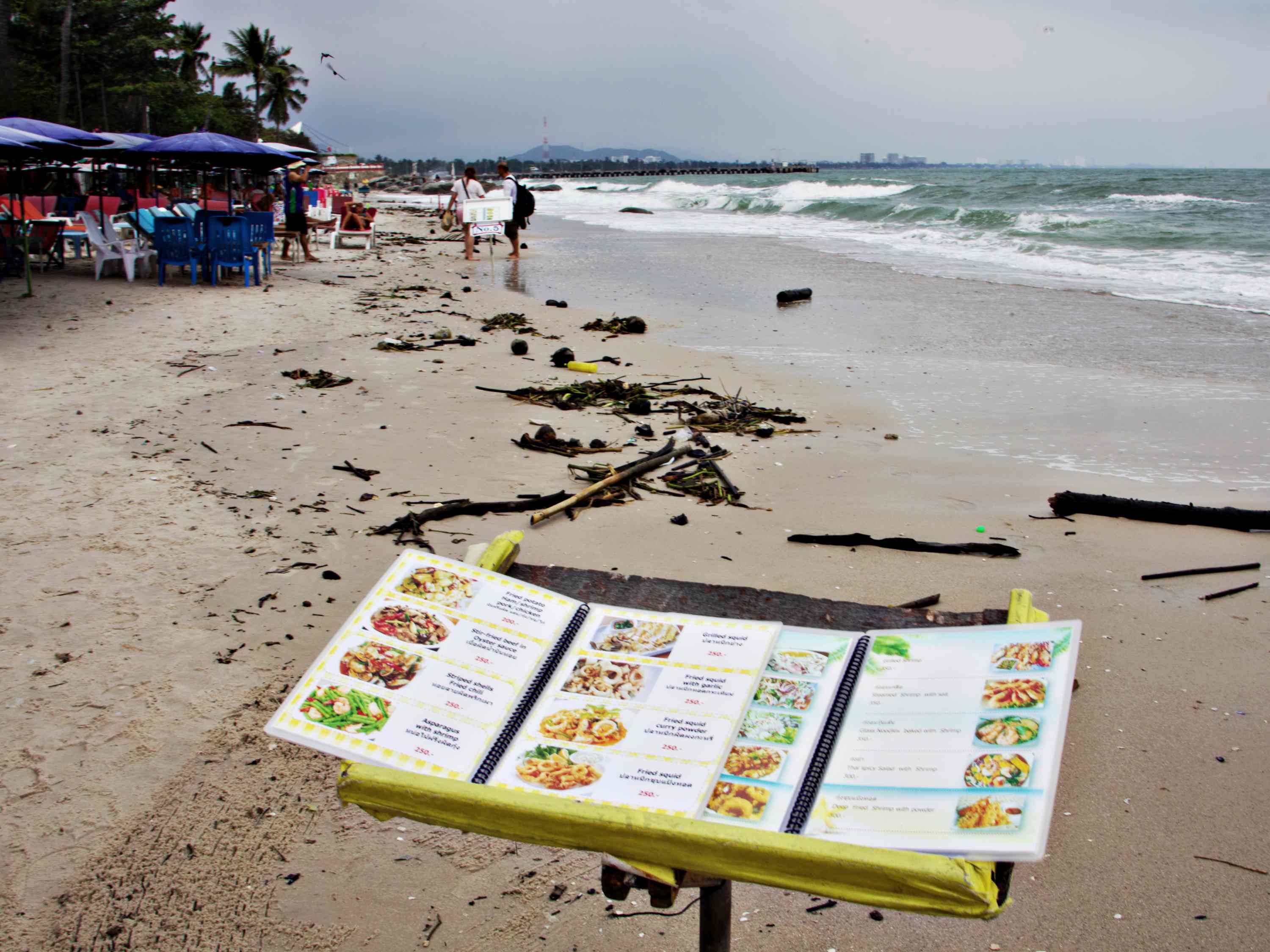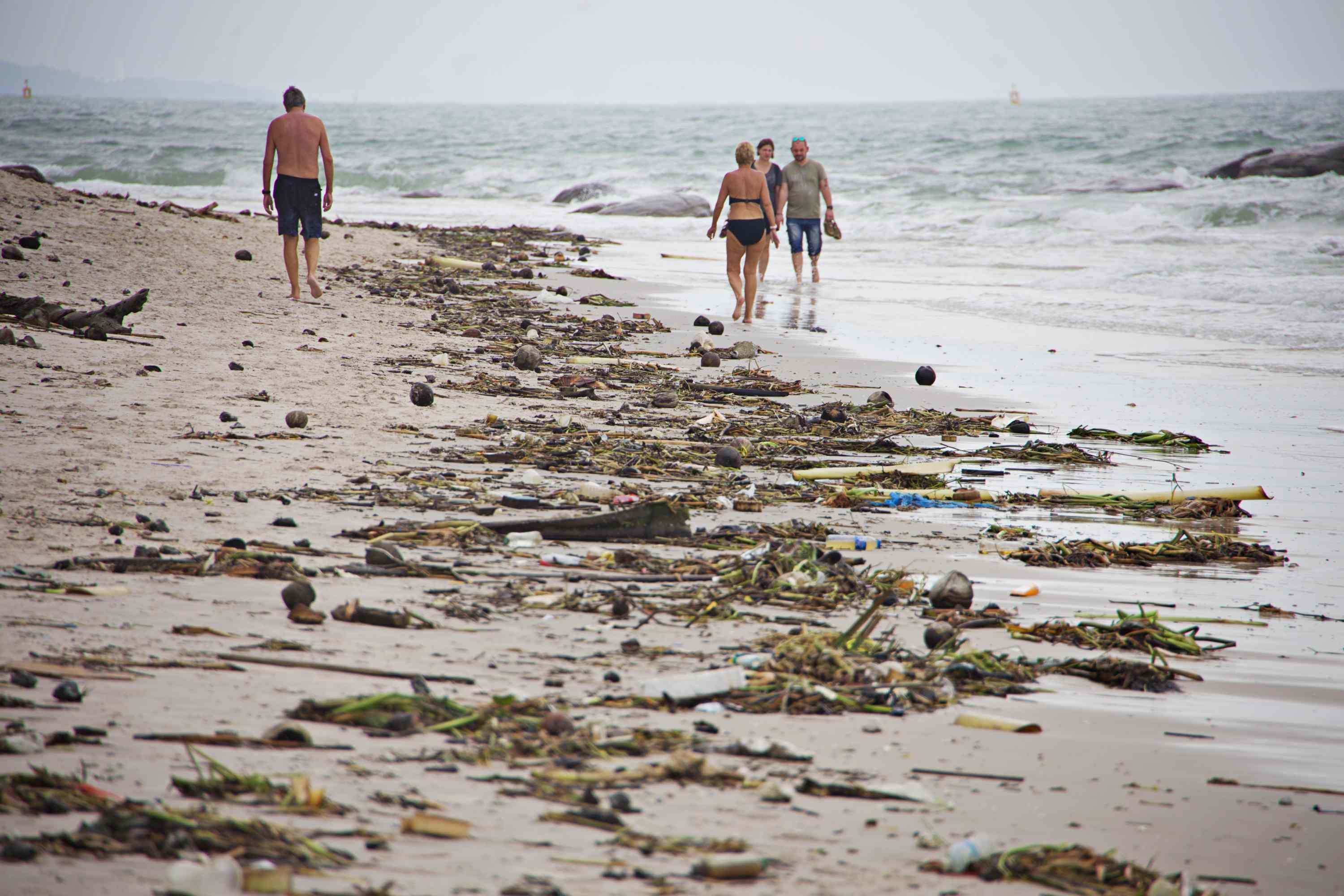 Die Schuhe bleiben an den Füssen. Sie schützen vor Glassplittern und scharfkantigem Plastik. Wir wandern fünf Kilometer vorbei an natürlichem Treibgut und menschengemachtem Müll. Dazwischen erkennen wir hin und wieder auch Sand. Das Navi auf dem Handy bestätigt: wir sind noch immer am Traumstrand von Hua Hin. In anderthalb Stunden hätten wir ein 200-teiliges Besteck aus Plastik und den Tagesbedarf an Plastikstrohhalmen für alle Berliner Barbetriebe aufsammeln können. Neben all dem anderen Hausrat, den das Meer anschwemmt.