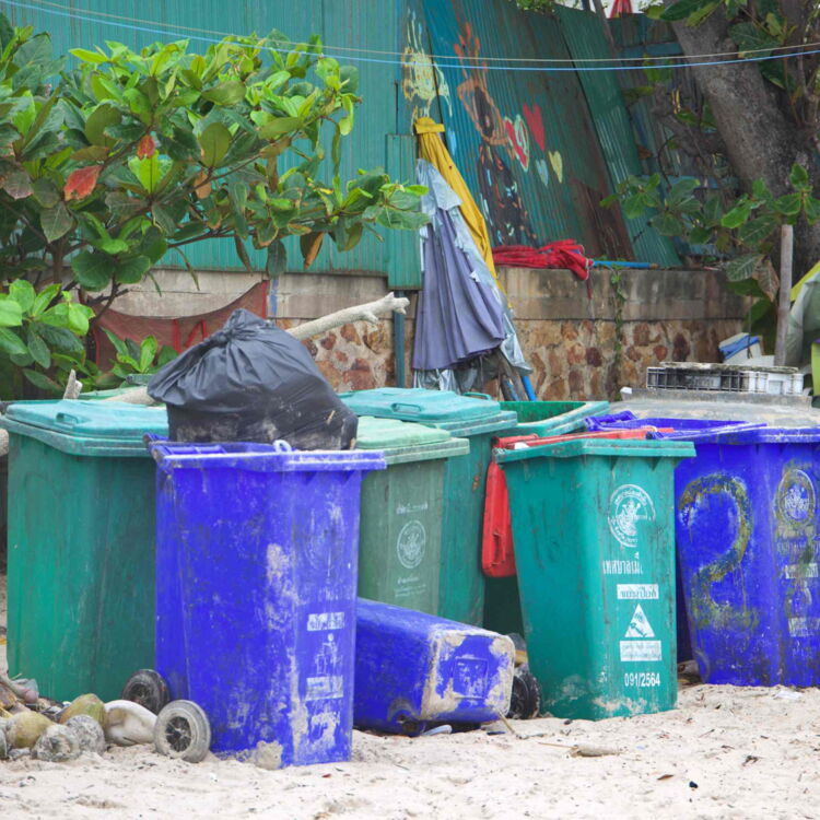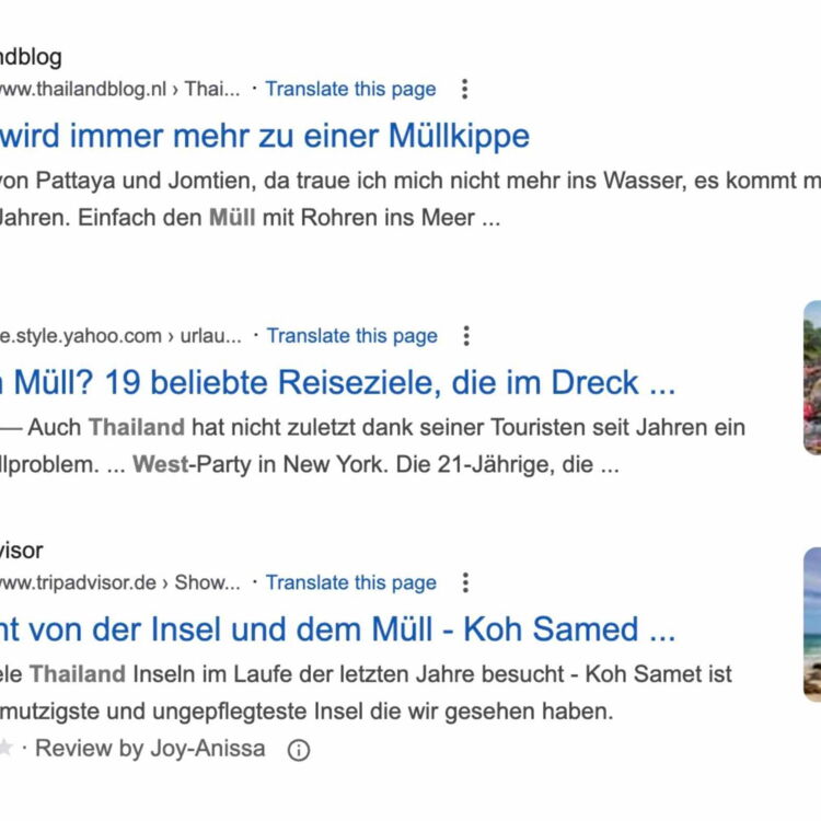 Der Spaziergang führt uns in konzentrierter Form vor Augen, was uns bereits während der ganzen Reise aufgestoßen ist. Abgesehen von umfriedeten und besonders gepflegten Hotel- und Tempelanlagen, finden wir in Thailand keine zehn Quadratmeter am Stück, die nicht plastikvermüllt sind. Viel zu spät recherchieren wir, was wir lange vor Buchung hätten tun sollen. Selbst den sagenumwobenen Urlaubsdestinationen wie Phuket und Ko Samui steht der Müll bis zum Hals. Und noch immer schwadronieren Reisende und Werbetreibende mit gläsernen Augen von den Trauminseln.
