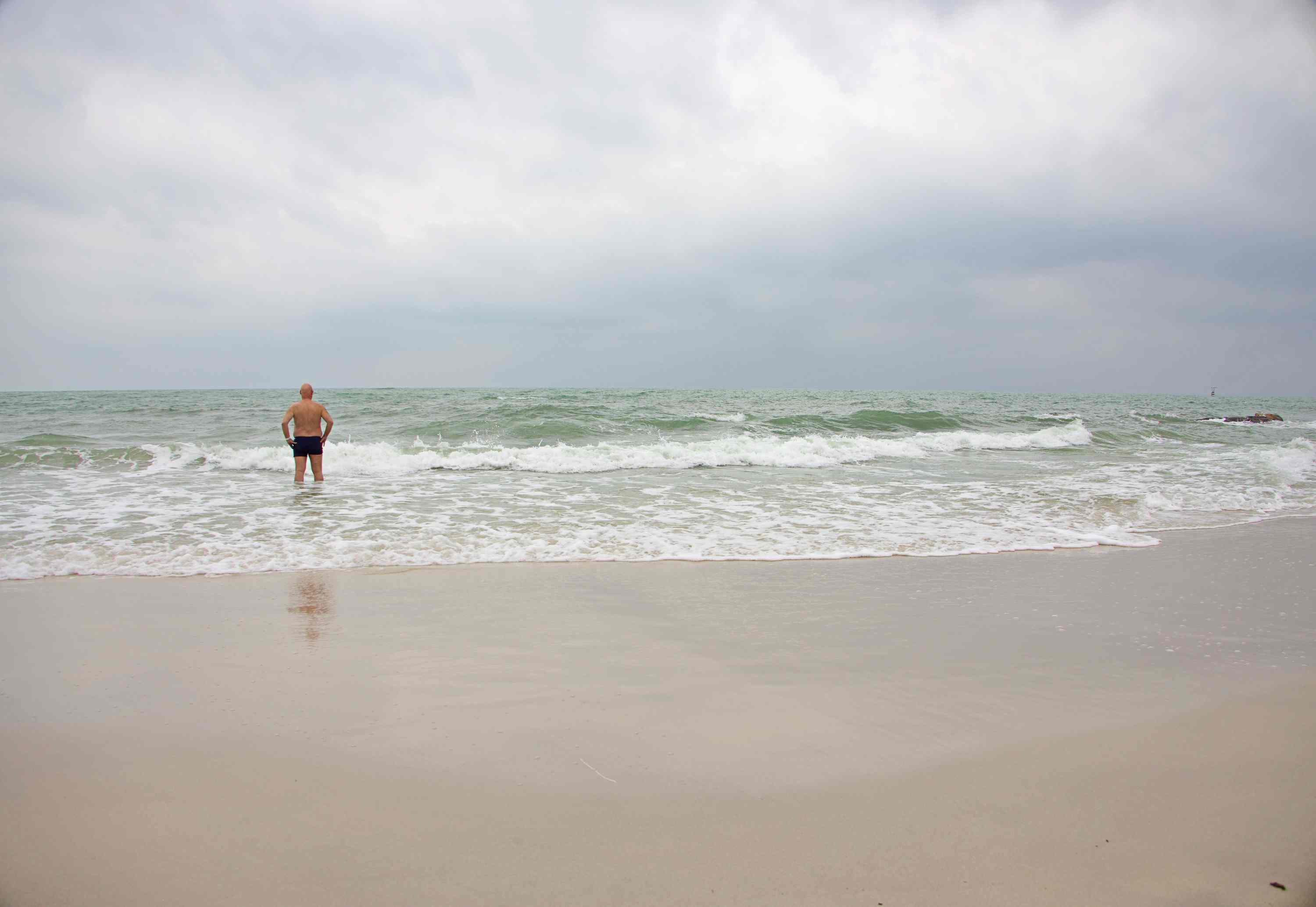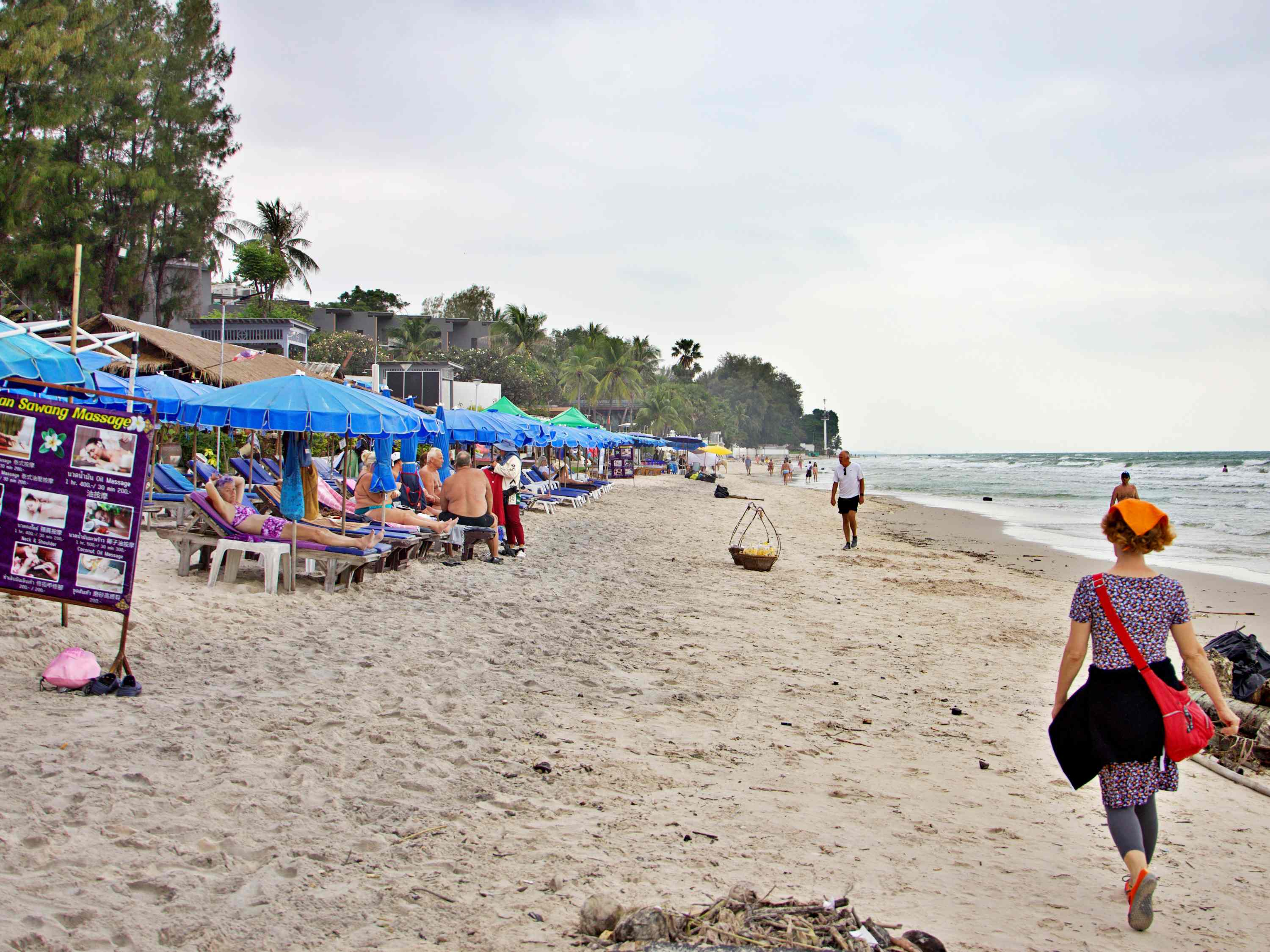 Von der Hotelanlage aus blicken wir über die glasklaren Pools hinweg auf den Golf von Thailand. Wasser bis zum Horizont. Den Sandstrand sehen wir nicht. Die Anlage liegt auf einem Plateau etwa zwei Meter über dem Meeresspiegel. Wir wollen den warmen Sand unter unseren nackten Füssen spüren und freuen uns auf einen stundenlangen Spaziergang entlang des überall in höchsten Tönen besungenen Traumstrandes von Hua Hin.