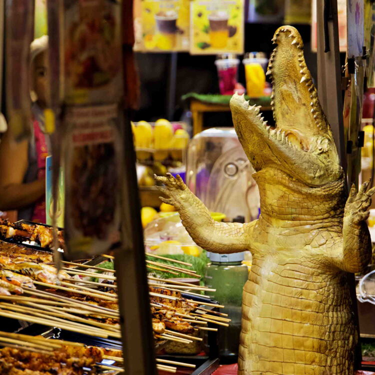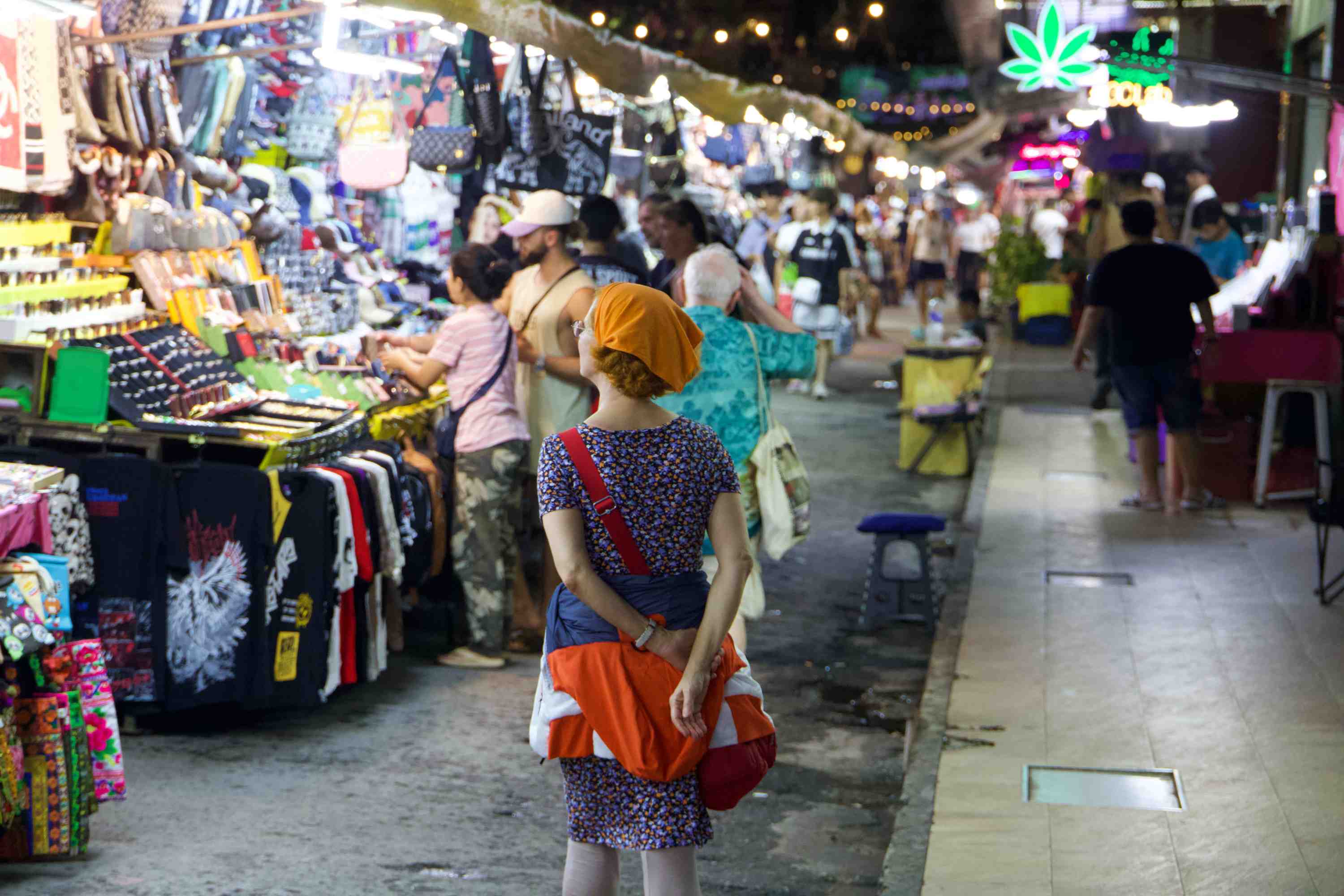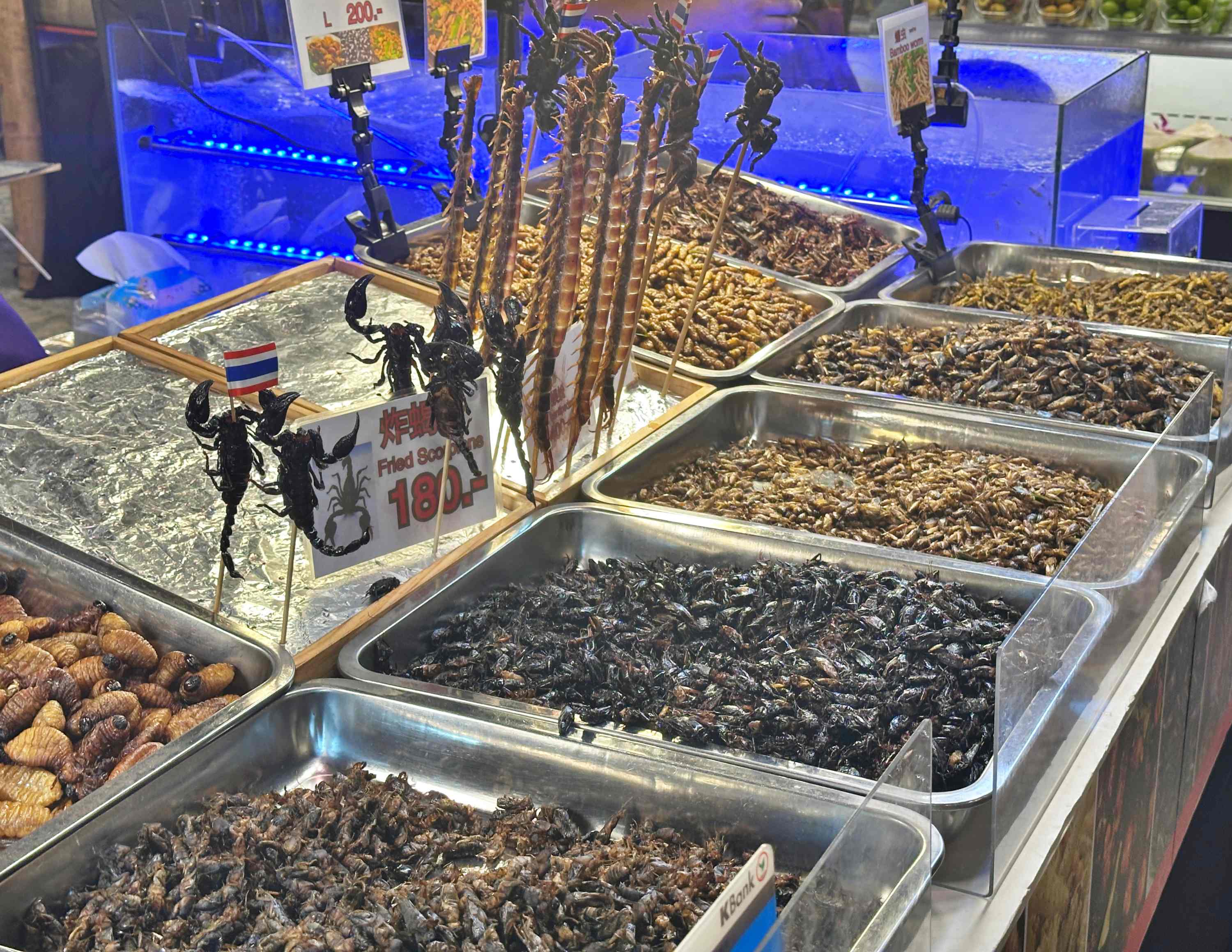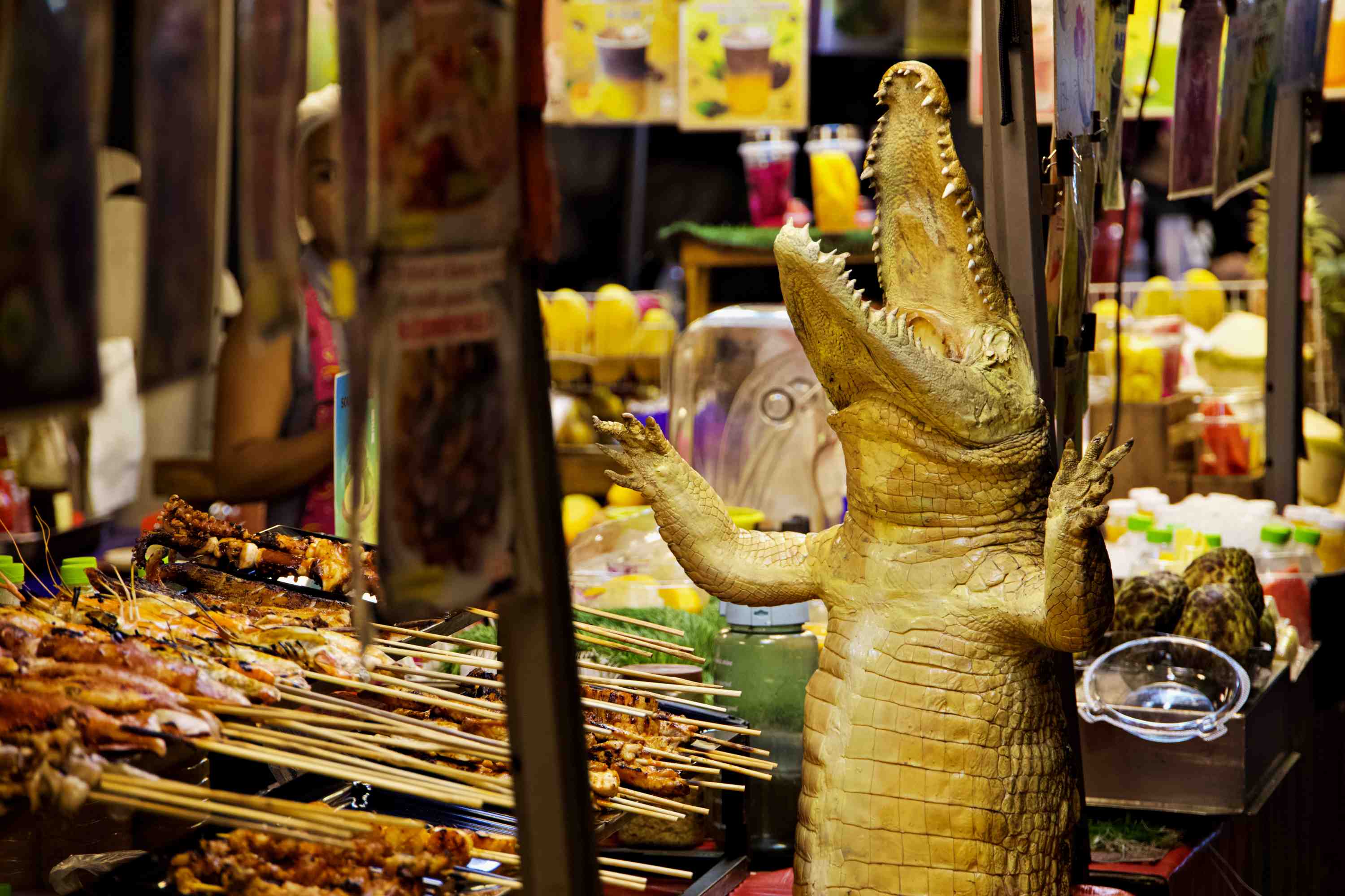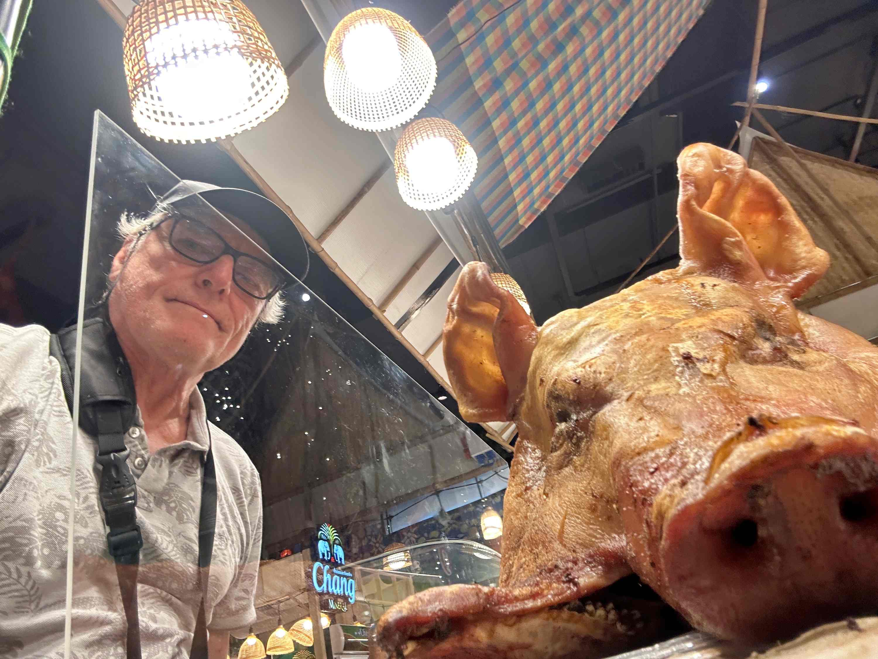 Keine Ahnung, was die Rote von einem Nachtmarkt erwartet hat, was wir vorfinden, entspricht nur hier und da ihren Erwartungen. Normalerweise ist die Zahl der Taschen und Tüten, gefüllt mit Marketenderwaren und Zeug, ein Hinweis auf ihren Zuspruch. Als wir den Markt verlassen, beträgt die Zahl der Käufe Null. Und auch den Krokodilspieß, den sie mutig probiert - schließlich sind wir ja in Thailand - beschreibt sie als Schuhsohle mit Fischgeschmack. Derweil freut sich der Chronist über seine Pommes mit Ketchup, die er in Berlin auch nicht besser bekommt.