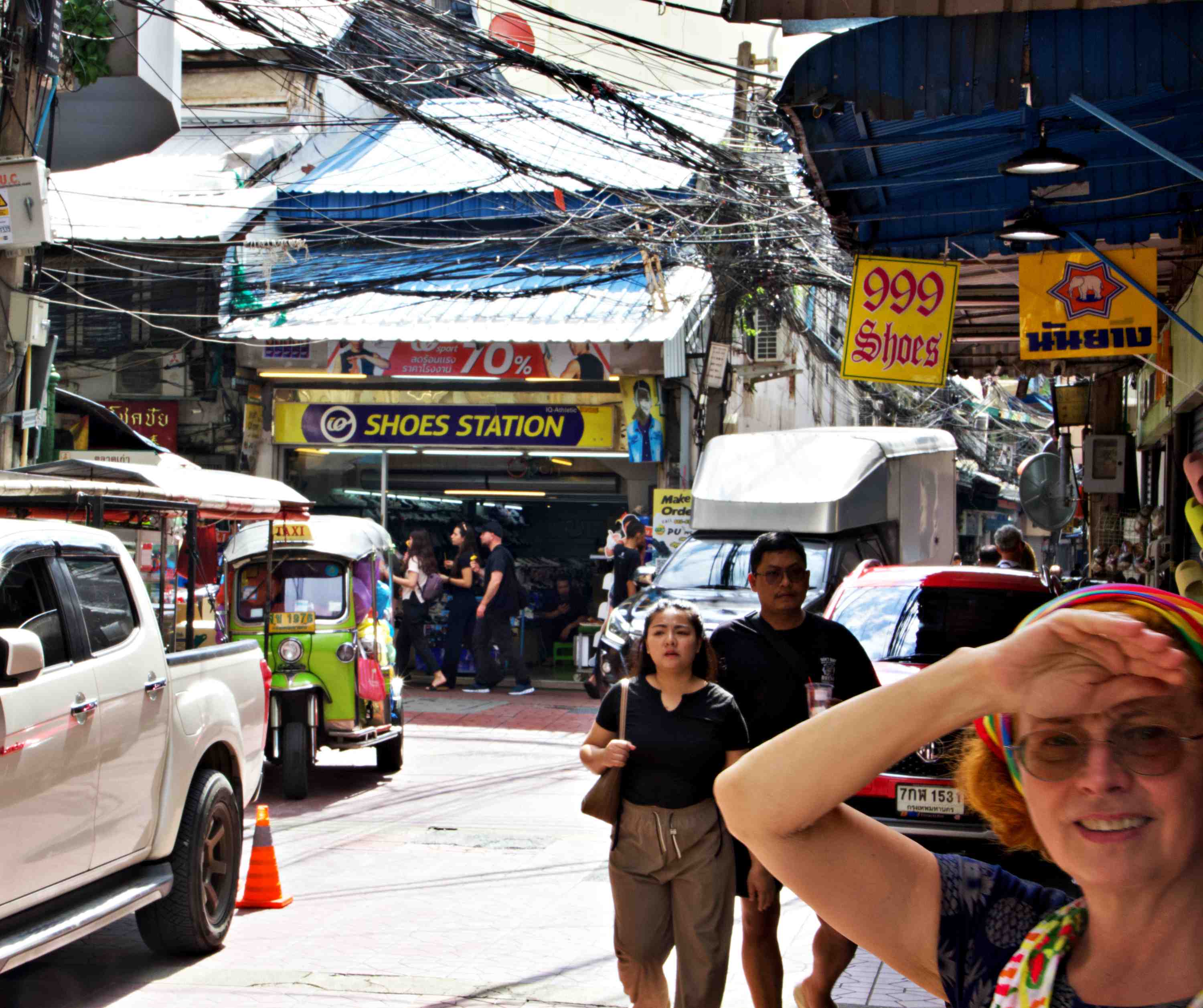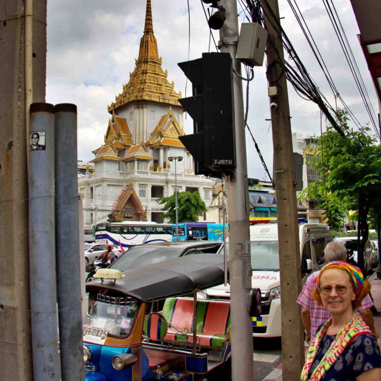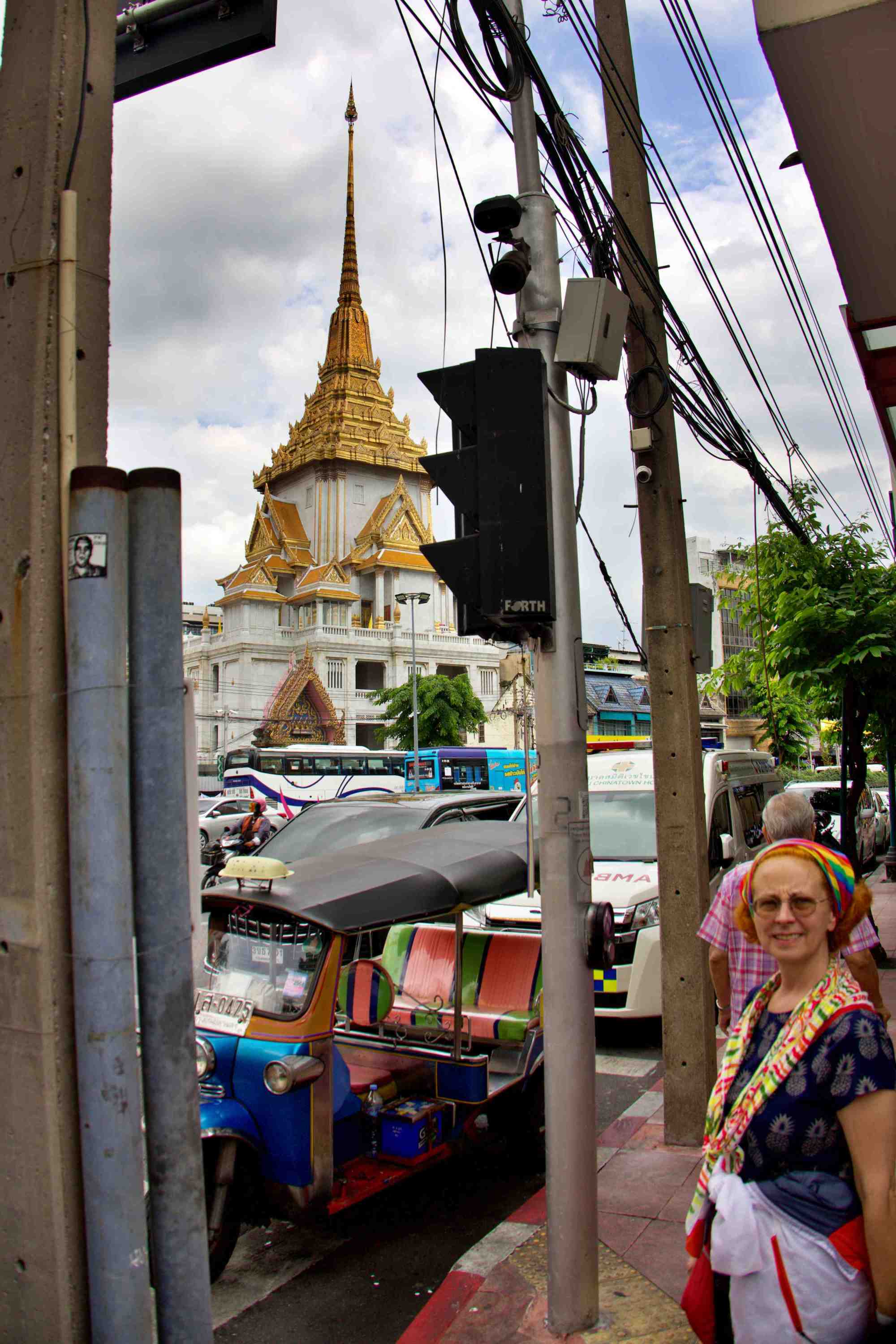 Nur wenige Schritte vom Hotel entfernt werden wir Teil eines Strudels aus Menschen und Fahrzeugen in Bewegung, unablässig umgeben von Geräuschen und Gerüchen. Alles scheint gleichzeitig zu fließen, zu kreisen, und sich gegenseitig zu verschlingen. Unsere bevorzugten Fortbewegungsarten werden die eigenen Beine, der gut organisierte Fährbetrieb auf dem Fluß Chao Phraya und das Tuk-Tuk. Die legendäre Auto-Rikscha - ein kleines, dreirädriges motorisiertes Fahrzeug - ist wendig, schnell und billig. Während wir damit durch die Blechkolonnen sausen, fühlen wir uns im abgasschwangeren Fahrtwind wieder richtig jung und füllen unsere Lungen genussvoll mit exotischem Feinstaub.