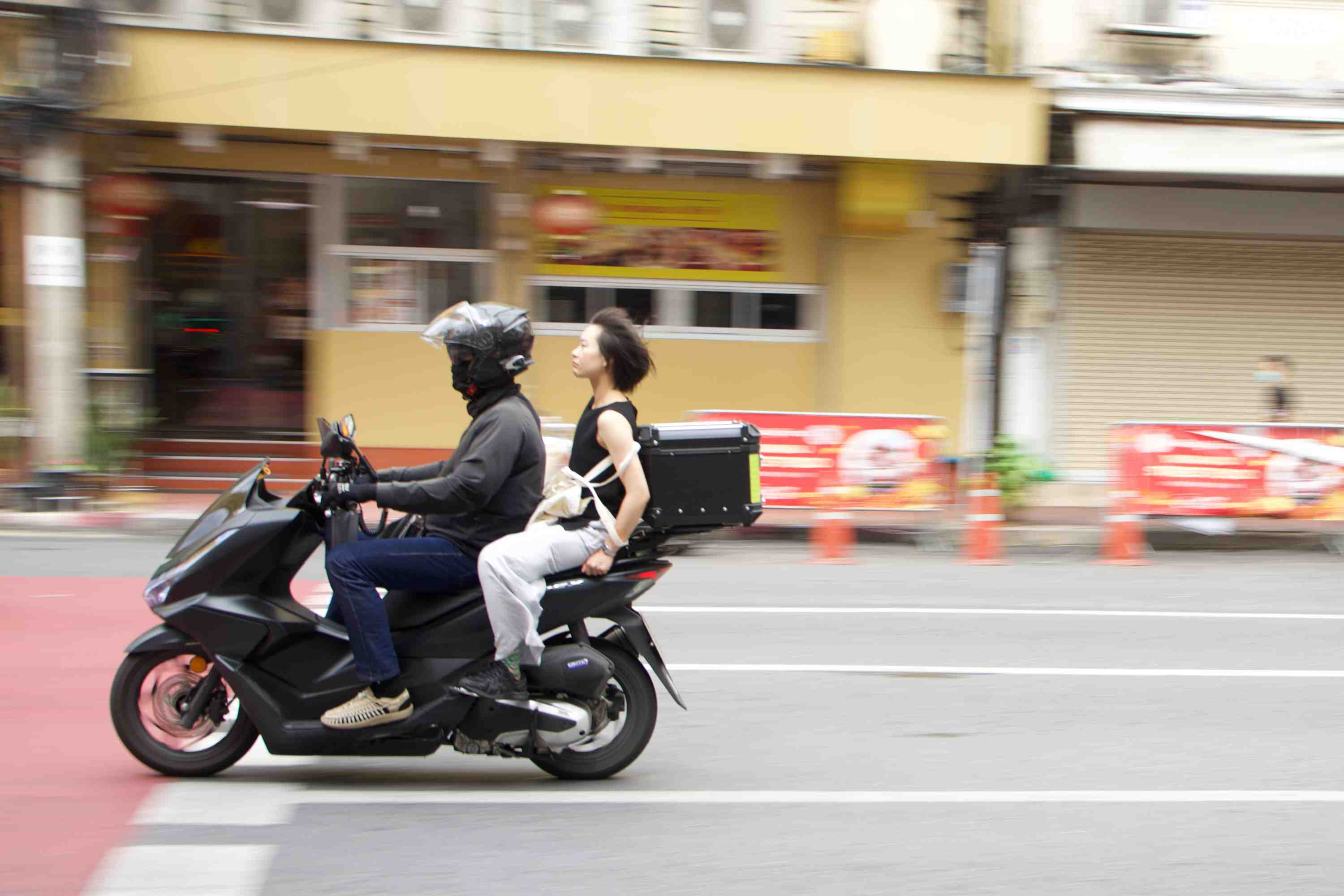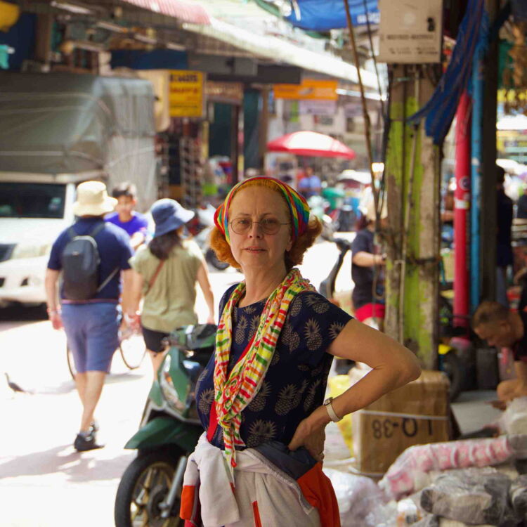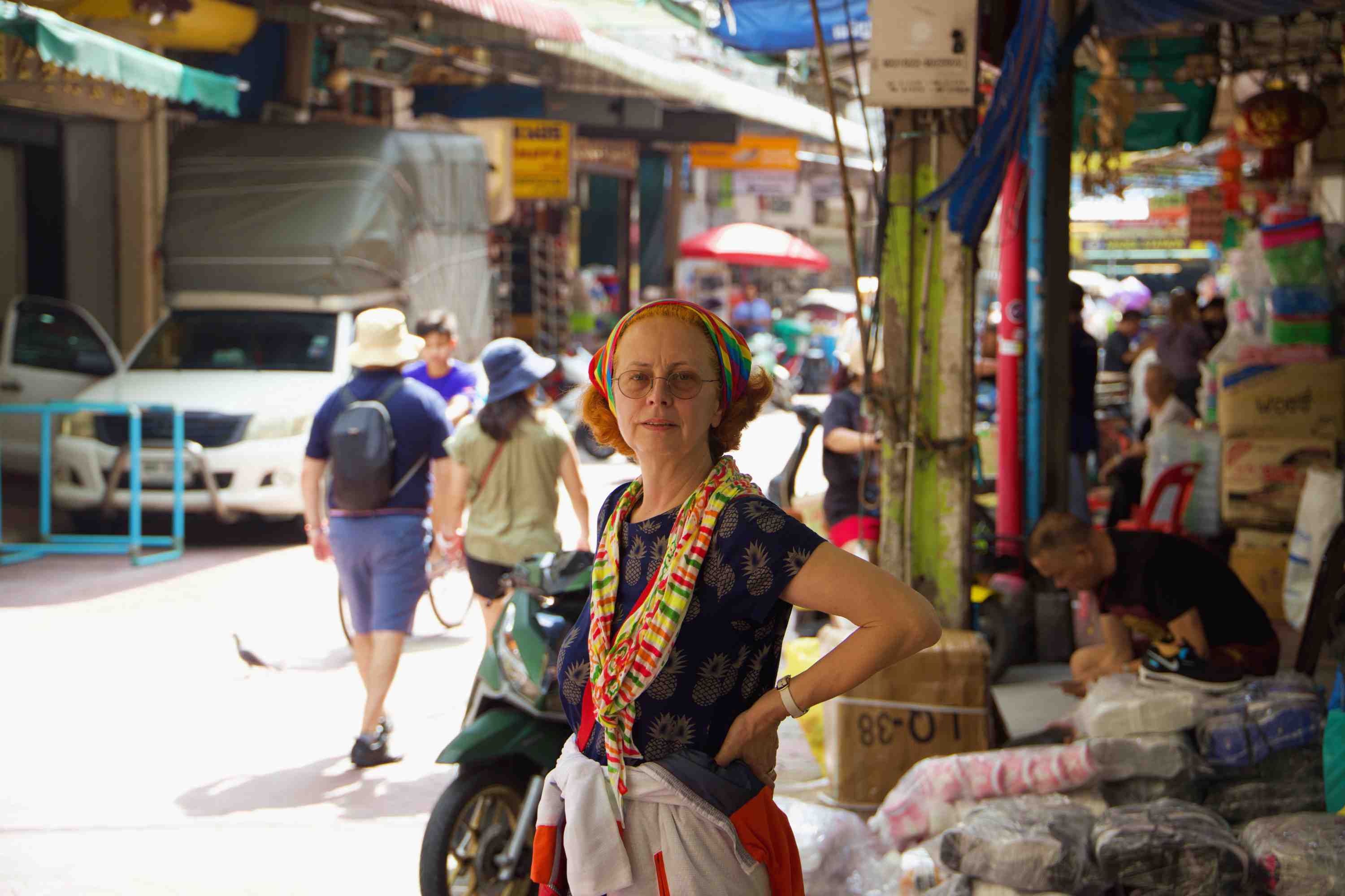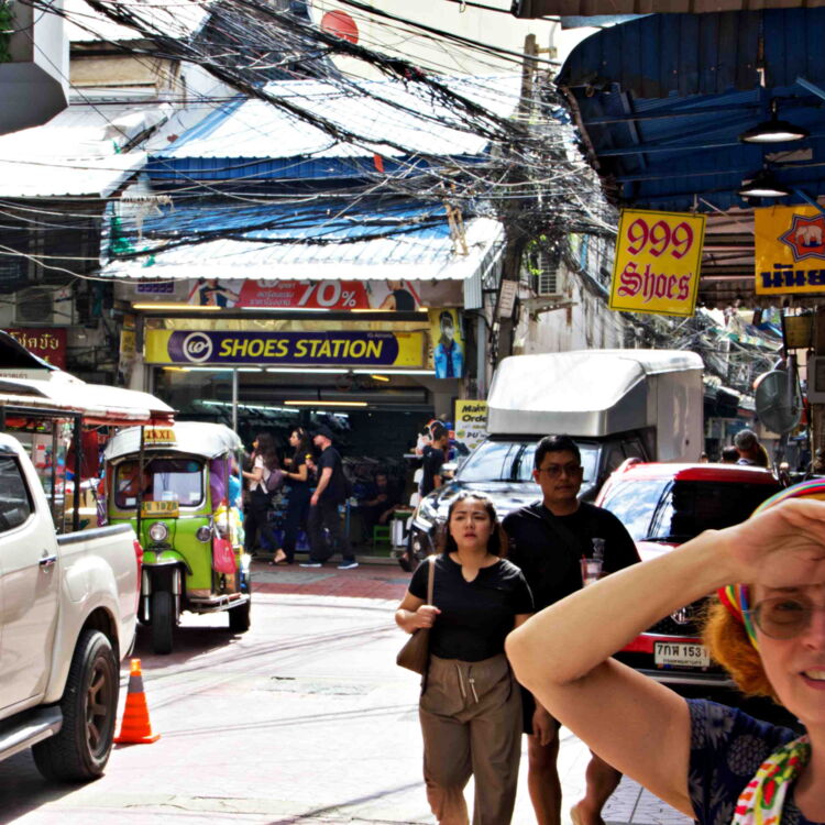 Nur wenige Schritte vom Hotel entfernt werden wir Teil eines Strudels aus Menschen und Fahrzeugen in Bewegung, unablässig umgeben von Geräuschen und Gerüchen. Alles scheint gleichzeitig zu fließen, zu kreisen, und sich gegenseitig zu verschlingen. Unsere bevorzugten Fortbewegungsarten werden die eigenen Beine, der gut organisierte Fährbetrieb auf dem Fluß Chao Phraya und das Tuk-Tuk. Die legendäre Auto-Rikscha - ein kleines, dreirädriges motorisiertes Fahrzeug - ist wendig, schnell und billig. Während wir damit durch die Blechkolonnen sausen, fühlen wir uns im abgasschwangeren Fahrtwind wieder richtig jung und füllen unsere Lungen genussvoll mit exotischem Feinstaub.