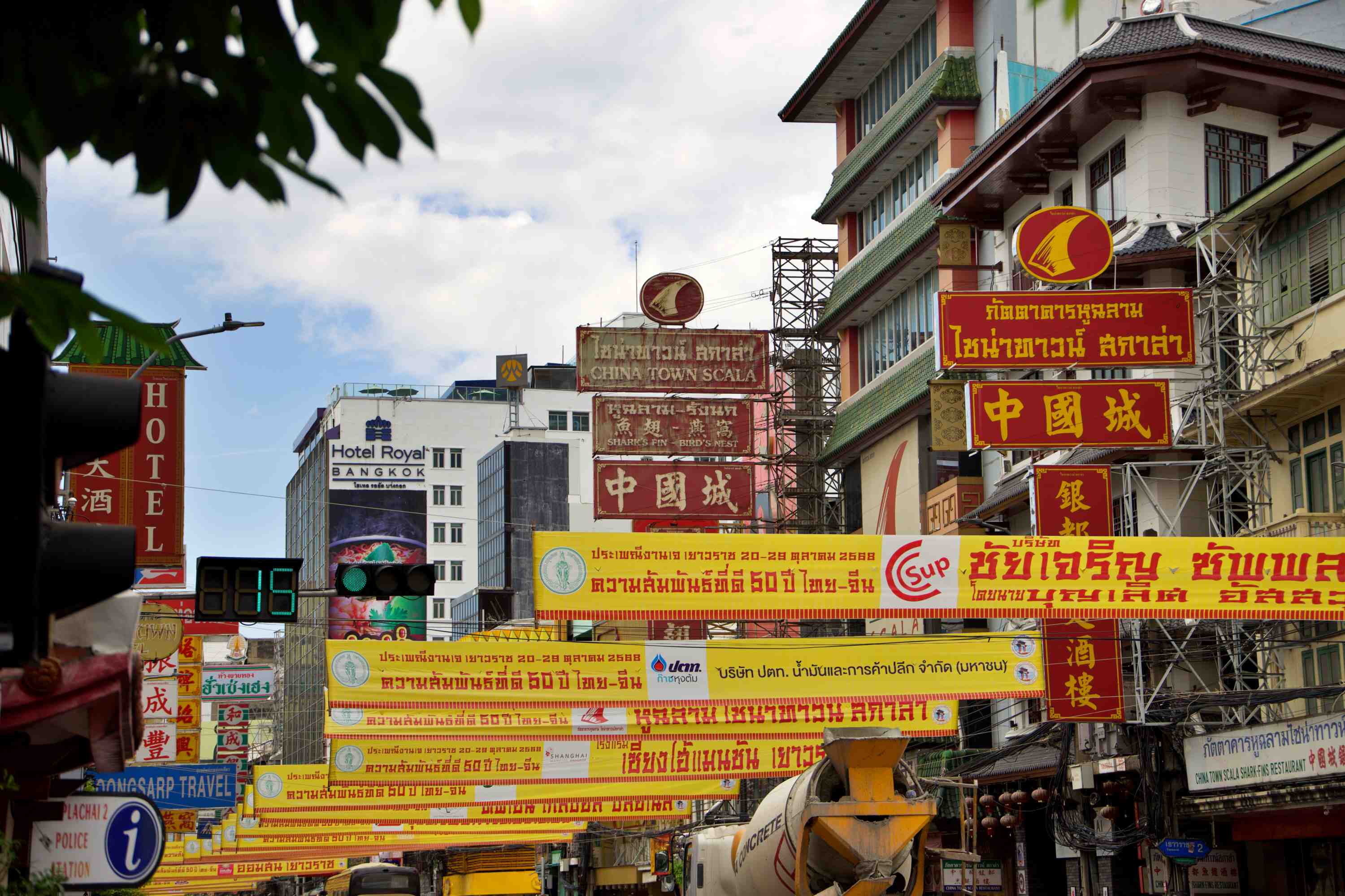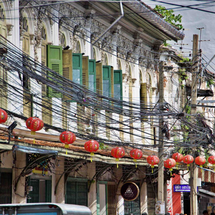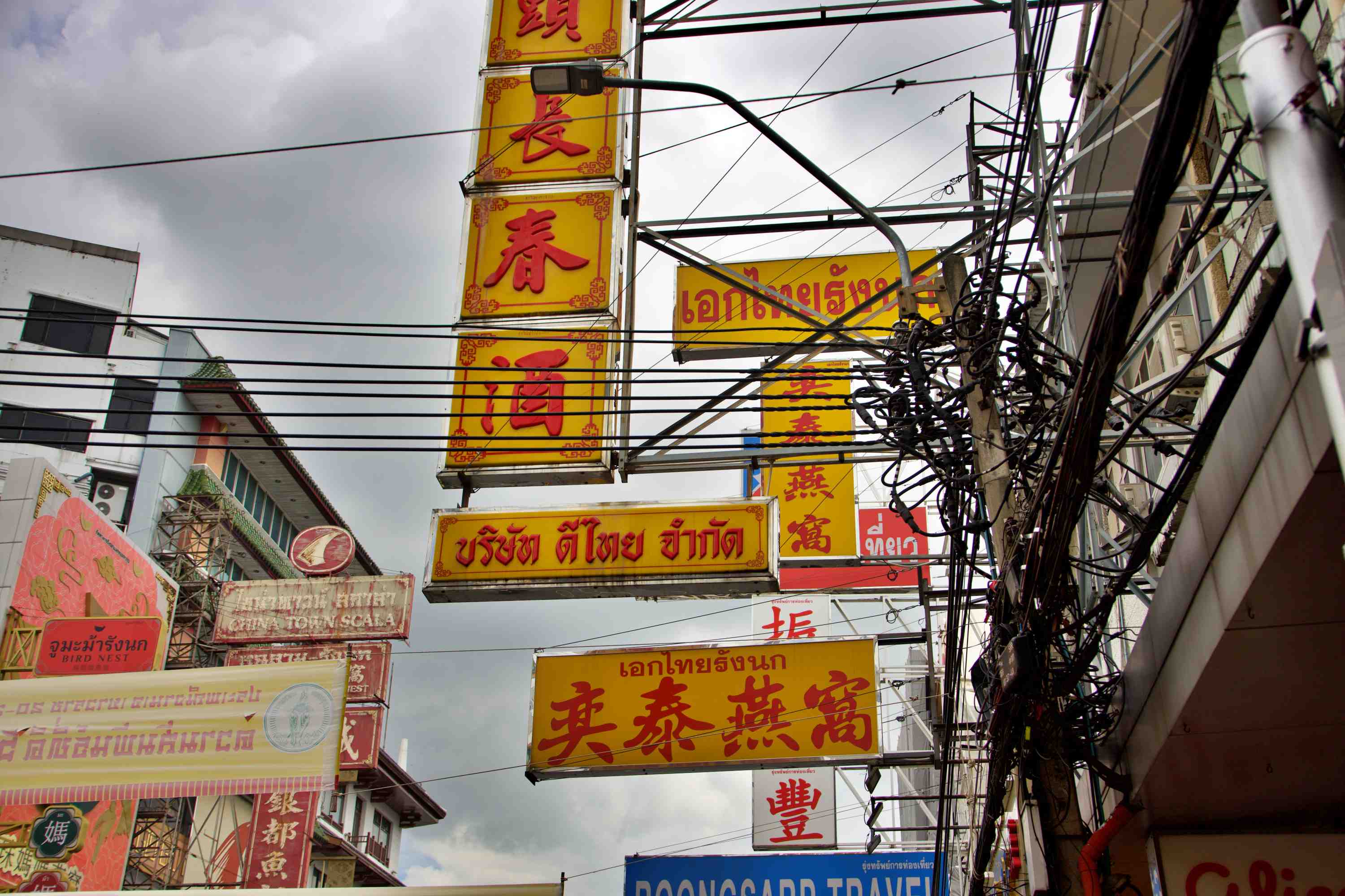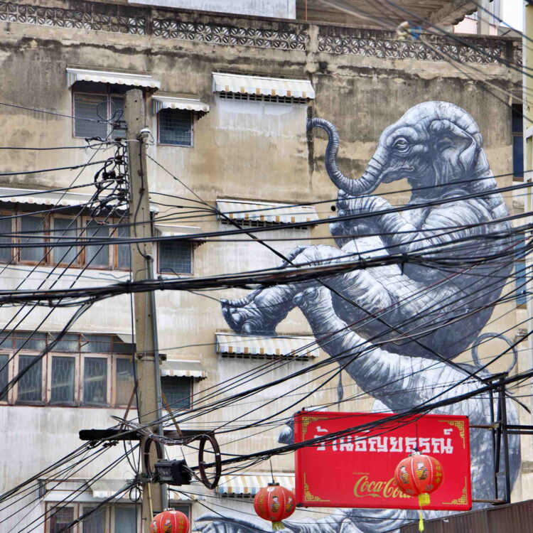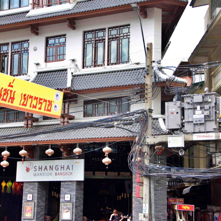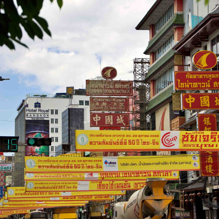 Mit der Gewissheit, dass es schlimmer nicht wird, erreichen wir Chinatown und werden einmal mehr überrascht. Der vergleichsweise kleine Fleck im Zentrum der Altstadt ist gleichsam ein Konzentrat und eine Steigerung von Restbangkok. Alles ist noch chaotischer, noch überfüllter, noch lauter und noch stickiger. Der Verkehr schiebt sich Stoßstange an Stoßstange durch enge Straßen, überall Motorenlärm, Abgase, Müllgeruch, eingefasst in feuchtwarmer Hitze. Viele Gebäude sind verfallen, Fenster vergittert, Wände schwarz von Abgasen. Menschen leben und arbeiten hier auf engstem Raum, ohne Ruhe, ohne Grün, ohne Platz. Selbst der Himmel ist verhängt mit Kabeln, Werbung, Laternen und Transparenten. Wer hier etwas Schönes finden will, etwas zum Verweilen, braucht viel Zeit. Die haben wir nicht. Stattdessen eine Verabredung in einem der modernsten Bauwerke der Stadt, auf der anderen Seite des Flusses.