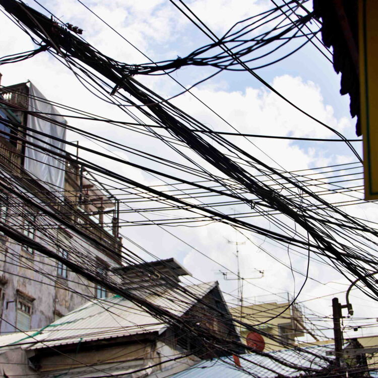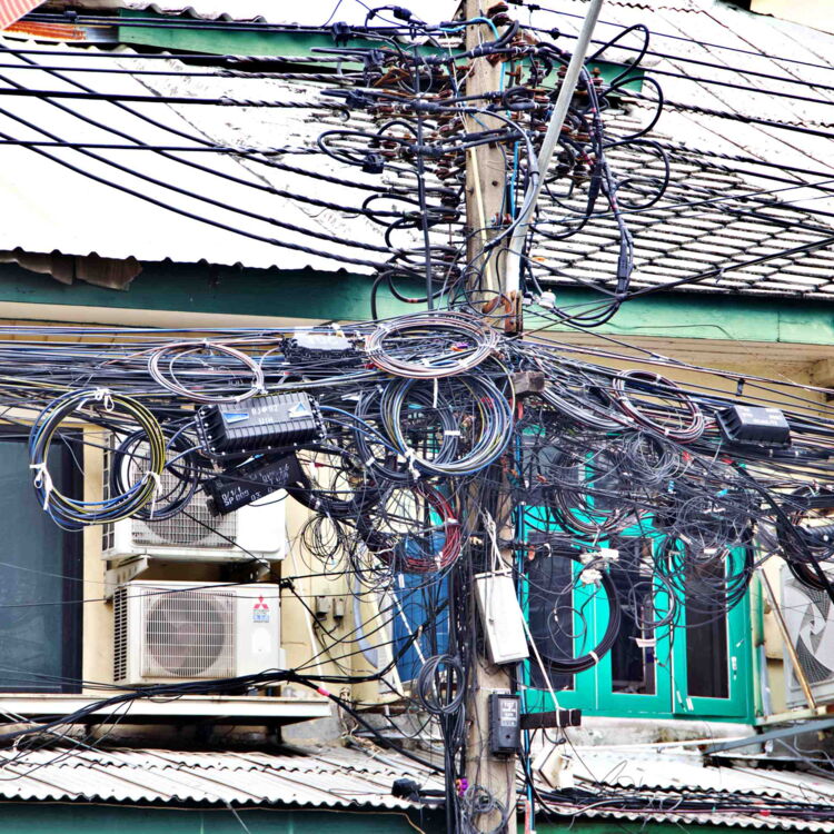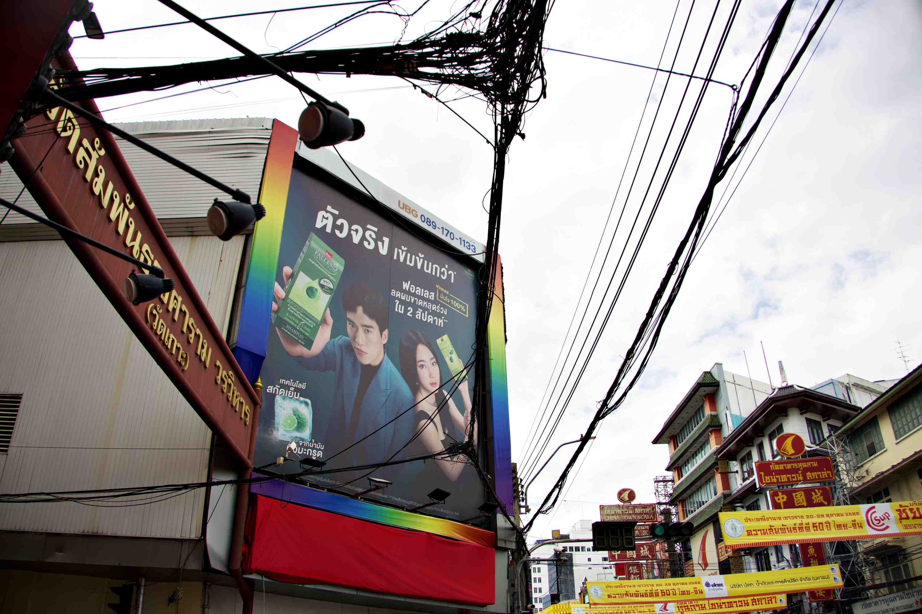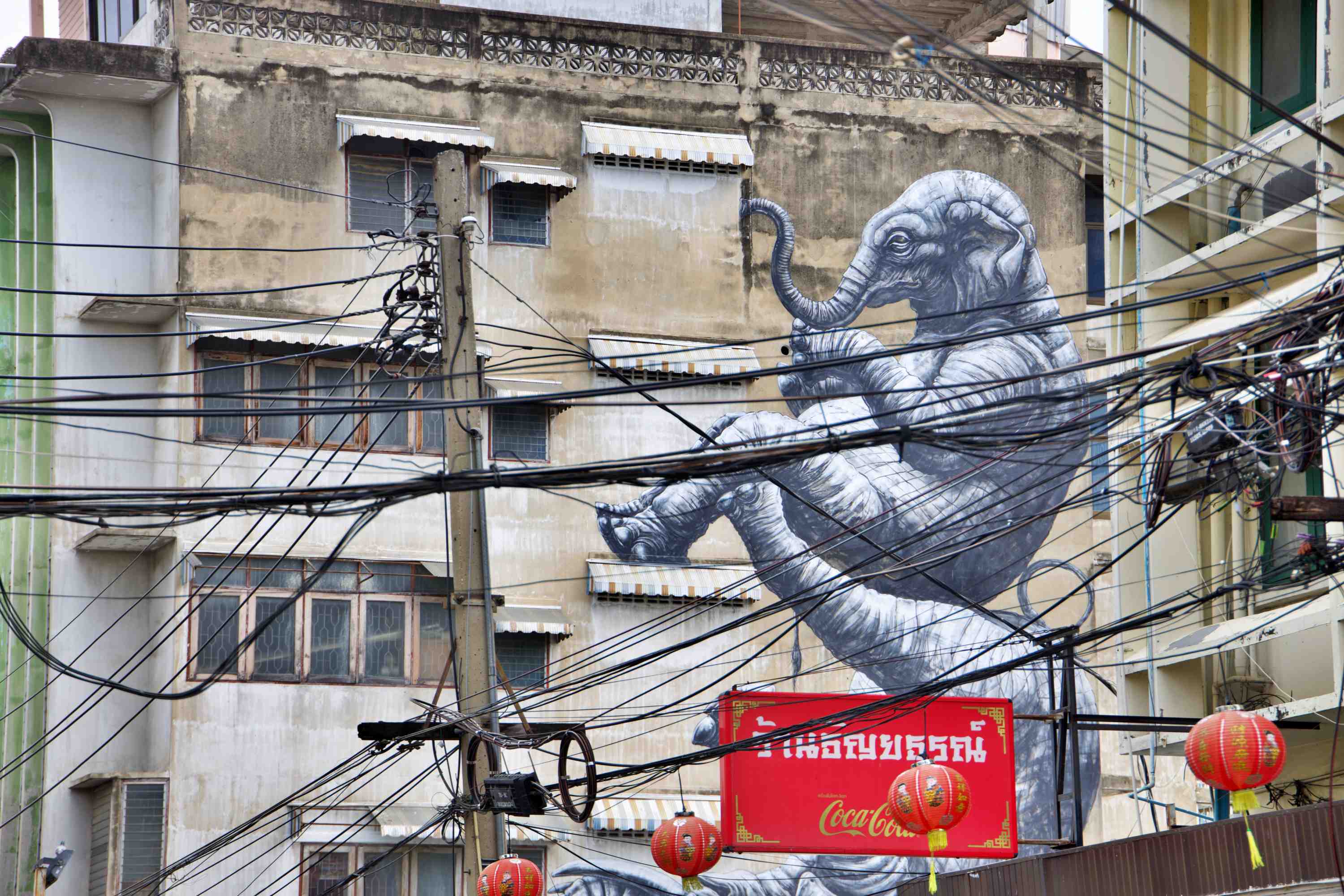 Mit der Gewissheit, dass es schlimmer nicht wird, erreichen wir Chinatown und werden einmal mehr überrascht. Der vergleichsweise kleine Fleck im Zentrum der Altstadt ist gleichsam ein Konzentrat und eine Steigerung von Restbangkok. Alles ist noch chaotischer, noch überfüllter, noch lauter und noch stickiger. Der Verkehr schiebt sich Stoßstange an Stoßstange durch enge Straßen, überall Motorenlärm, Abgase, Müllgeruch, eingefasst in feuchtwarmer Hitze. Viele Gebäude sind verfallen, Fenster vergittert, Wände schwarz von Abgasen. Menschen leben und arbeiten hier auf engstem Raum, ohne Ruhe, ohne Grün, ohne Platz. Selbst der Himmel ist verhängt mit Kabeln, Werbung, Laternen und Transparenten. Wer hier etwas Schönes finden will, etwas zum Verweilen, braucht viel Zeit. Die haben wir nicht. Stattdessen eine Verabredung in einem der modernsten Bauwerke der Stadt, auf der anderen Seite des Flusses.