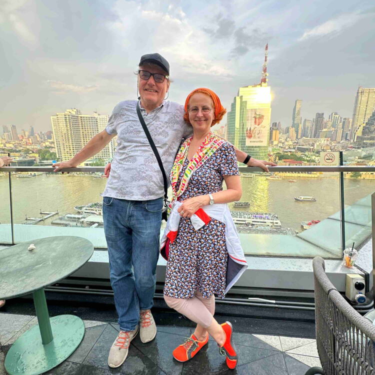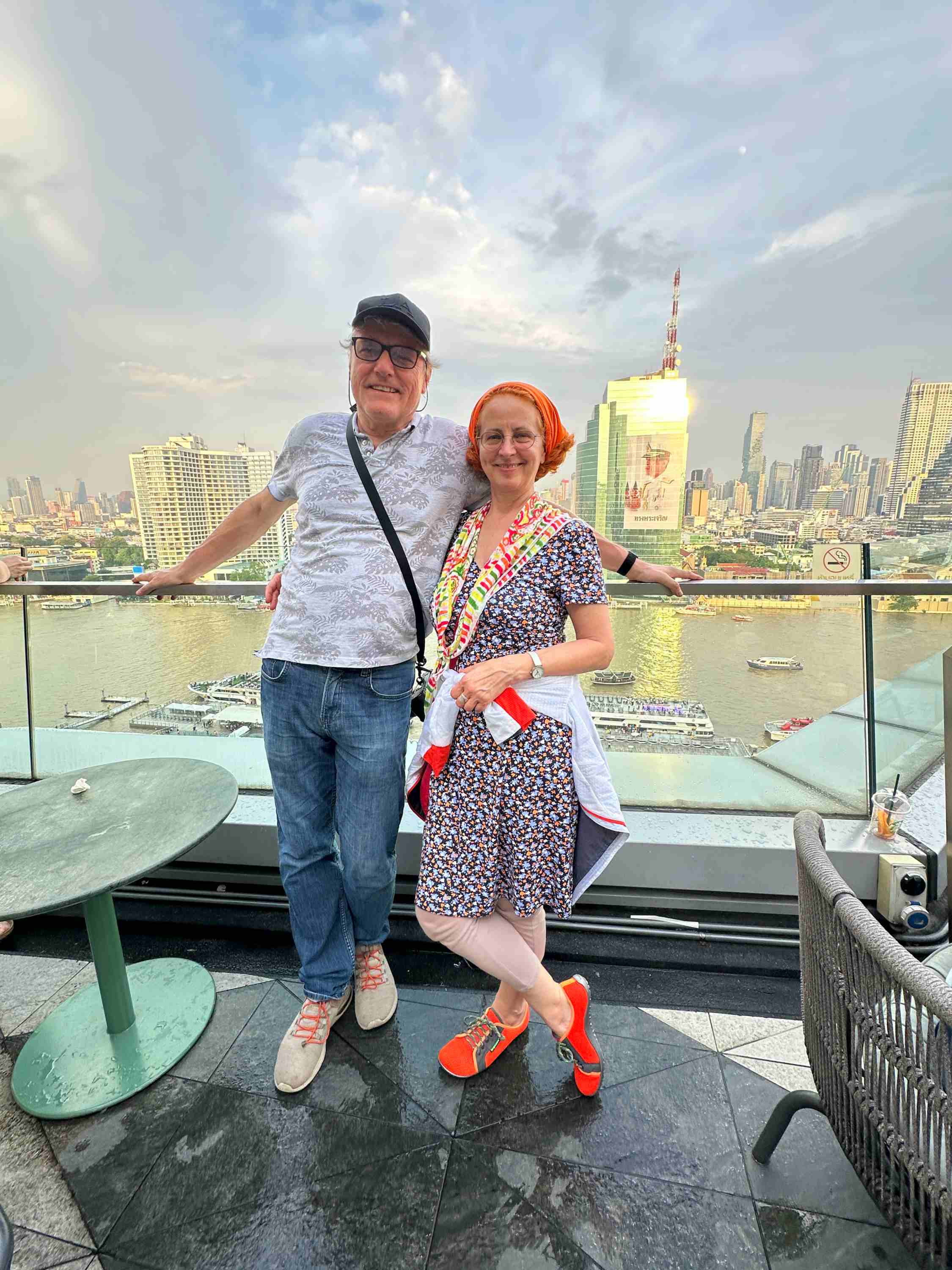 Wenn auf irgend etwas Verlass ist in dieser Welt, und also auch in Thailand, dann die Pünktlichkeit, mit der unser guter langjähriger Freund Klaus Heller zur gemeinsamen Verabredung erscheint. Normalerweise treffen wir den Autor, Verleger, Fotograf und Weltreisenden, wenn er wieder mal in Berlin ist. Nun also Bangkok. Thailand ist seine Wahlheimat für die Wintermonate. Er ist begeistert von Land und Leuten und gibt sich alle Mühe, uns anzustecken. Wir geniessen erstmal die entspannte und kurzweilige Zeit mit ihm auf der Terrasse von Starbucks in der siebenten Etage. Dazu ein weiterer überhöhter Blick auf Bangkok, das wie eine wundervoll blühende fleischfressende Pflanze ihre Opfer anzulocken versucht.