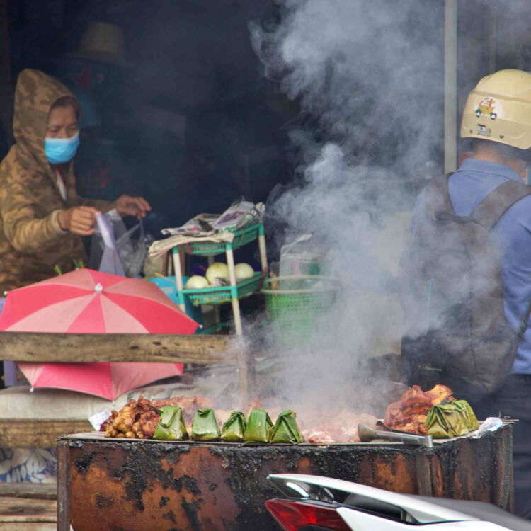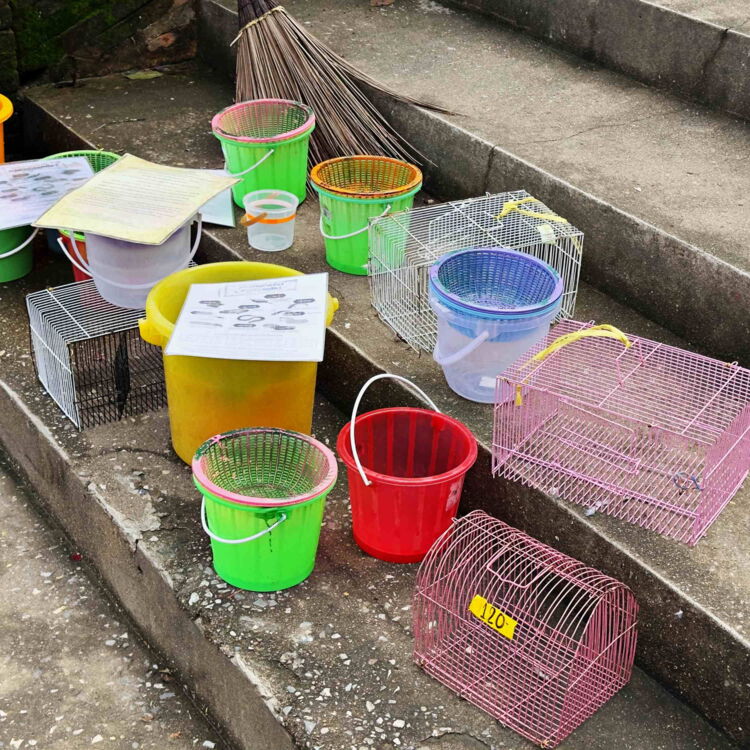 Zwei Stände kommen uns vor wie Aussenstellen einer Kleintierhandlung mit Schwerpunkt für Fische und Amphibien. Für kleines Geld können hier Eimer erworben werden, in die Fische, Frösche, Würmer, Krabben und ähnliche Lebewesen gefüllt werden. Damit geht man dann zum Fluss hinab und schenkt den Tieren dort die Freiheit. Das geht bereits mit einem Einsatz von umgerechnet einem Euro und ist wohl gut fürs Karma. Irgendwie trifft das nicht ganz unsere spirituelle Grundauffassung und wir können uns nicht überwinden, Kreaturen aus ihren Gefängnissen zu erlösen. Auch deswegen nicht, weil wir nicht herausfinden, wie es um das Seelenheil derer bestellt ist, die die Tiere zuvor in die Aquarien verbracht haben.