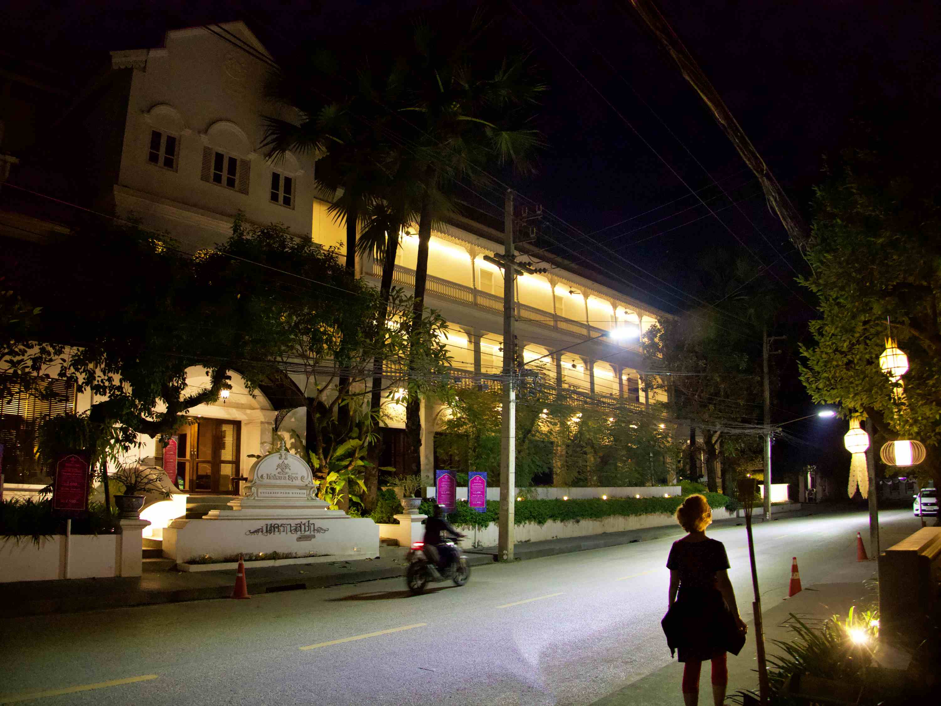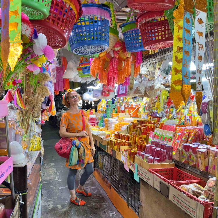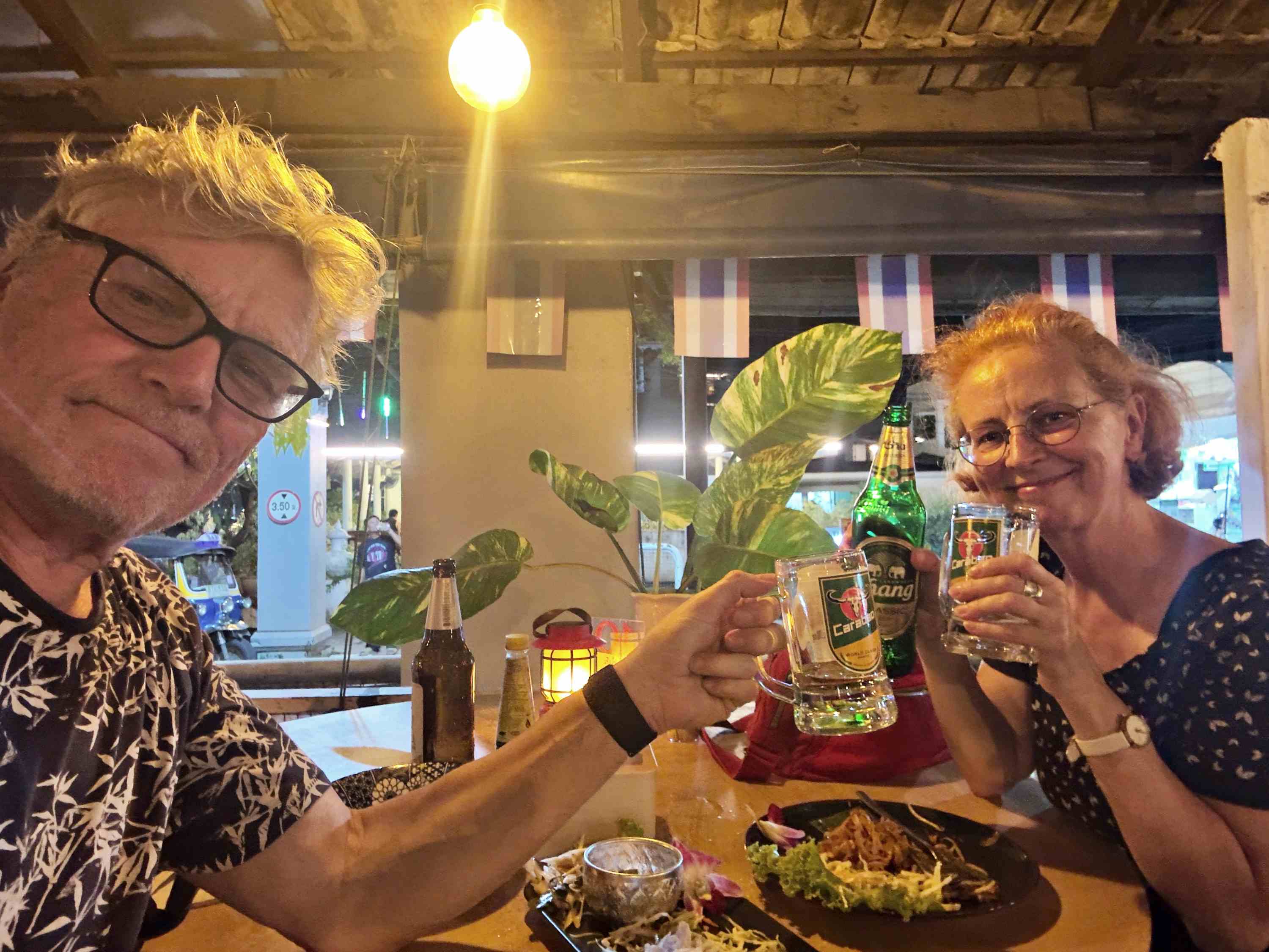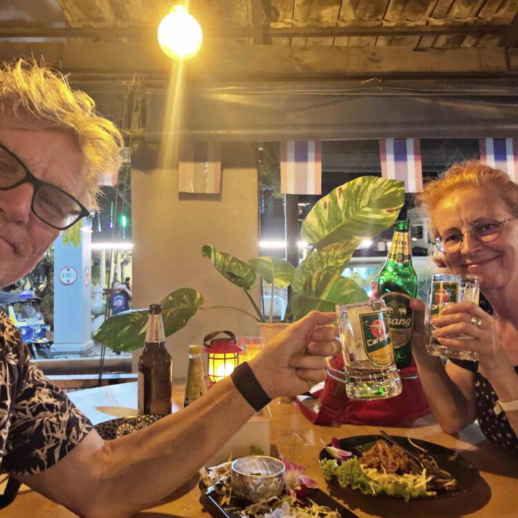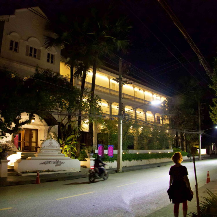 Als Unterkunft wählen wir diesmal ein atmosphärisches Hotel im Kolonialstil. Von dort erreichen wir alles im Innenstadtbereich zu Fuss. Bereits am ersten Abend geht es über einen Nachtmarkt, der diesen Namen auch verdient. Die Rote freuts. Den Grauen freuts, dass es die Rote freut. Und so freuen sich beide seit Ankunft in Thailand zum ersten Mal gemeinsam.