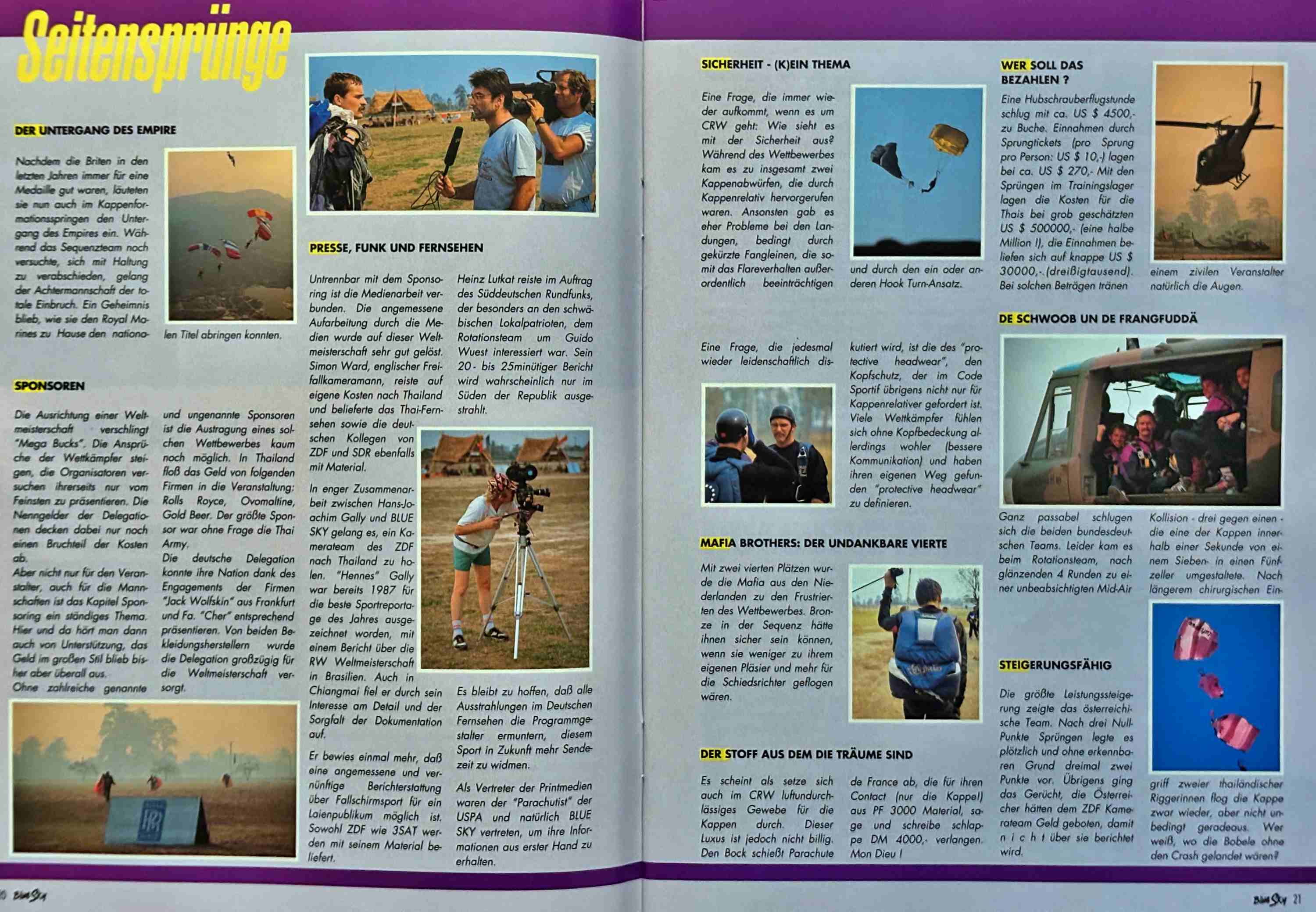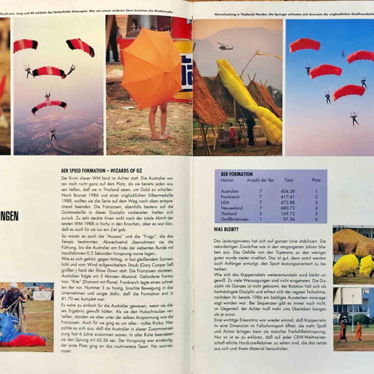 So ganz neu ist die neue Stadt, wie Chiang Mai übersetzt heisst, für mich nicht. Im April 1990 hatte ich die Ehre und das Vergnügen, die deutsche Nationalmannschaft im Fallschirmformationsspringen anläßlich der 3. Weltmeisterschaften als Delegationsleiter anzuführen. Und die wurden von der Thai Aero Sport Association in Chiang Mai ausgetragen. Ich nutzte die Veranstaltung seinerzeits auch, um für das seit Anfang 1990 von mir verlegte Magazin BLUE SKY- Fallschirmsport-Freizeit-Reisen aus erster Hand mit Fotos und Informationen zu versorgen. Am Ende wurden dem Event vier Doppelseiten gewidmet, so viel wie in keiner anderen Fachzeitschrift der Welt.
