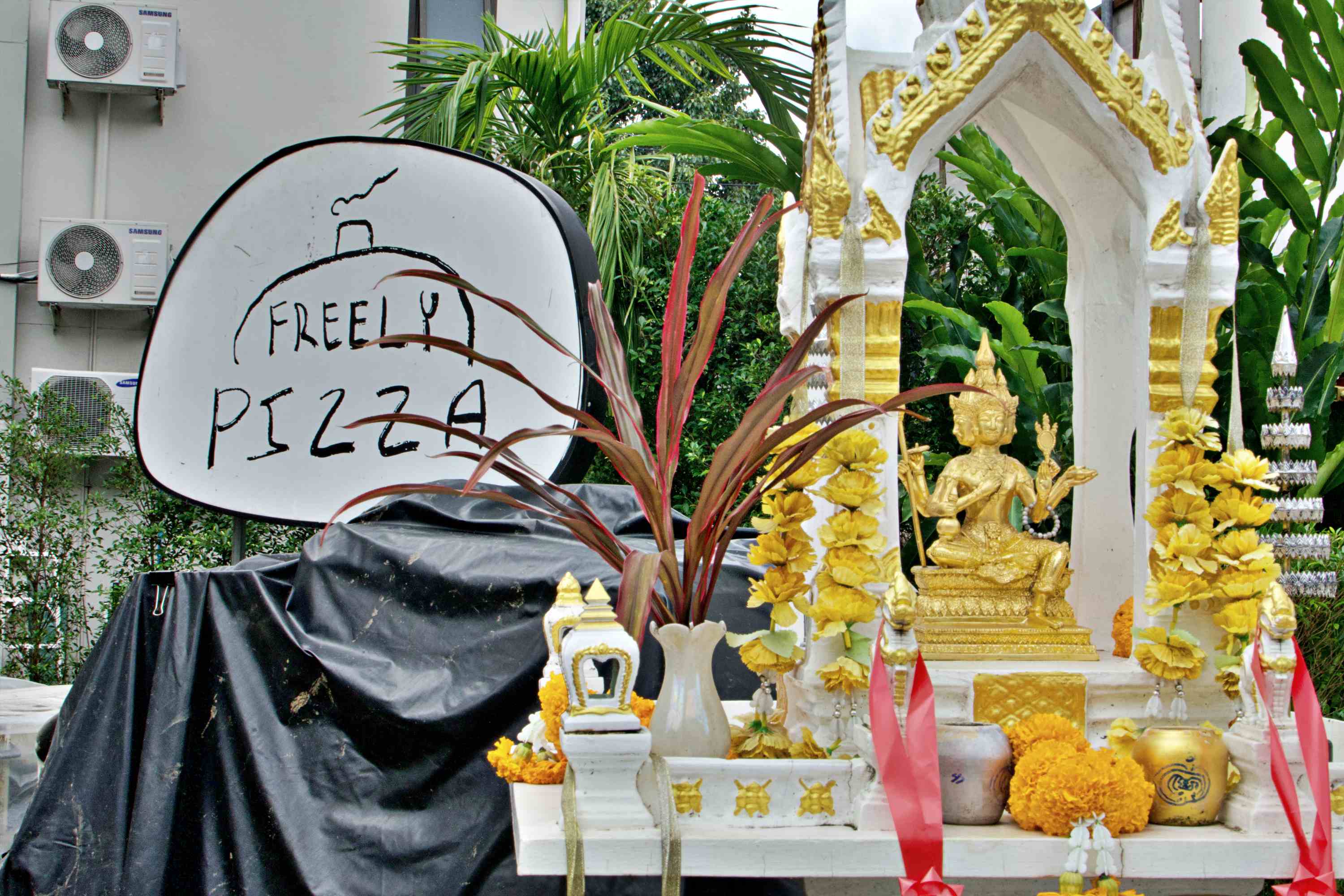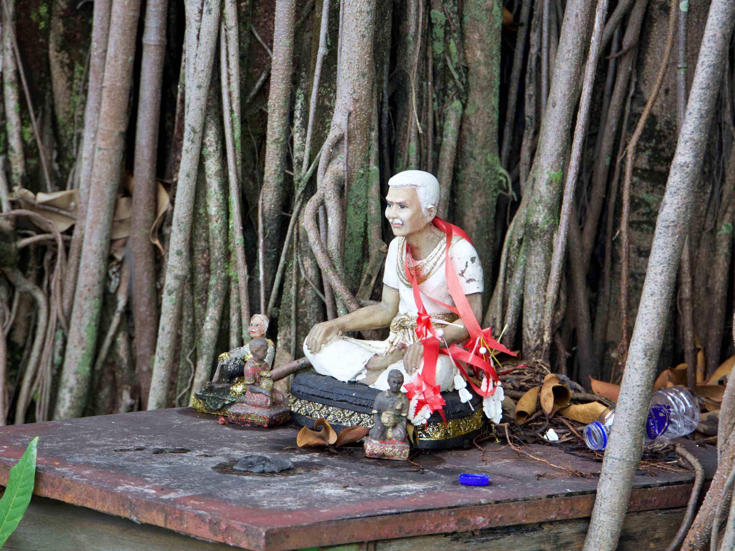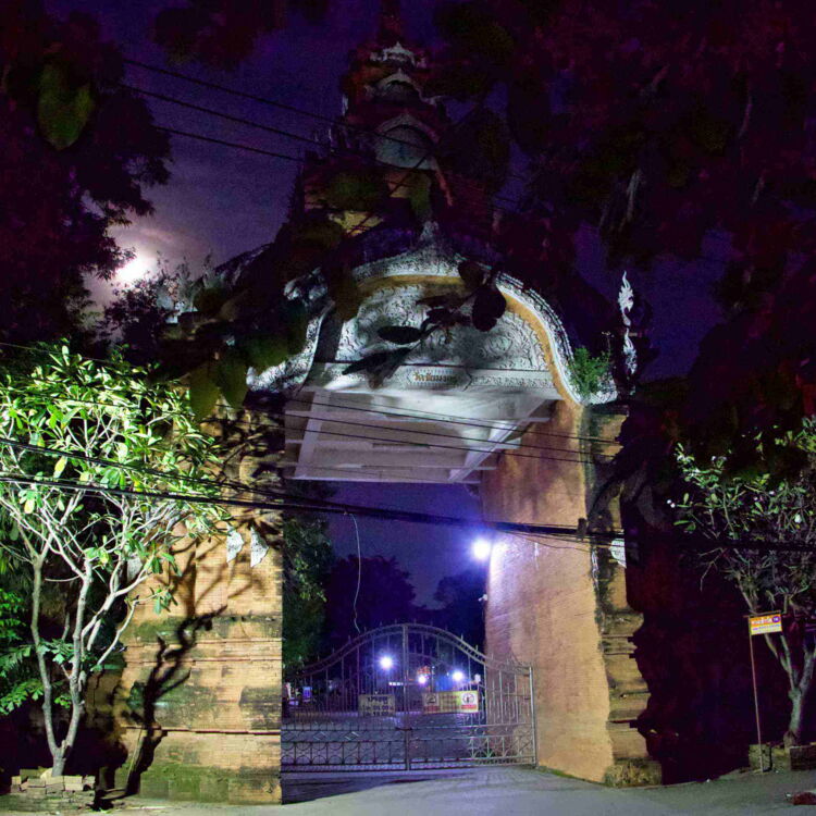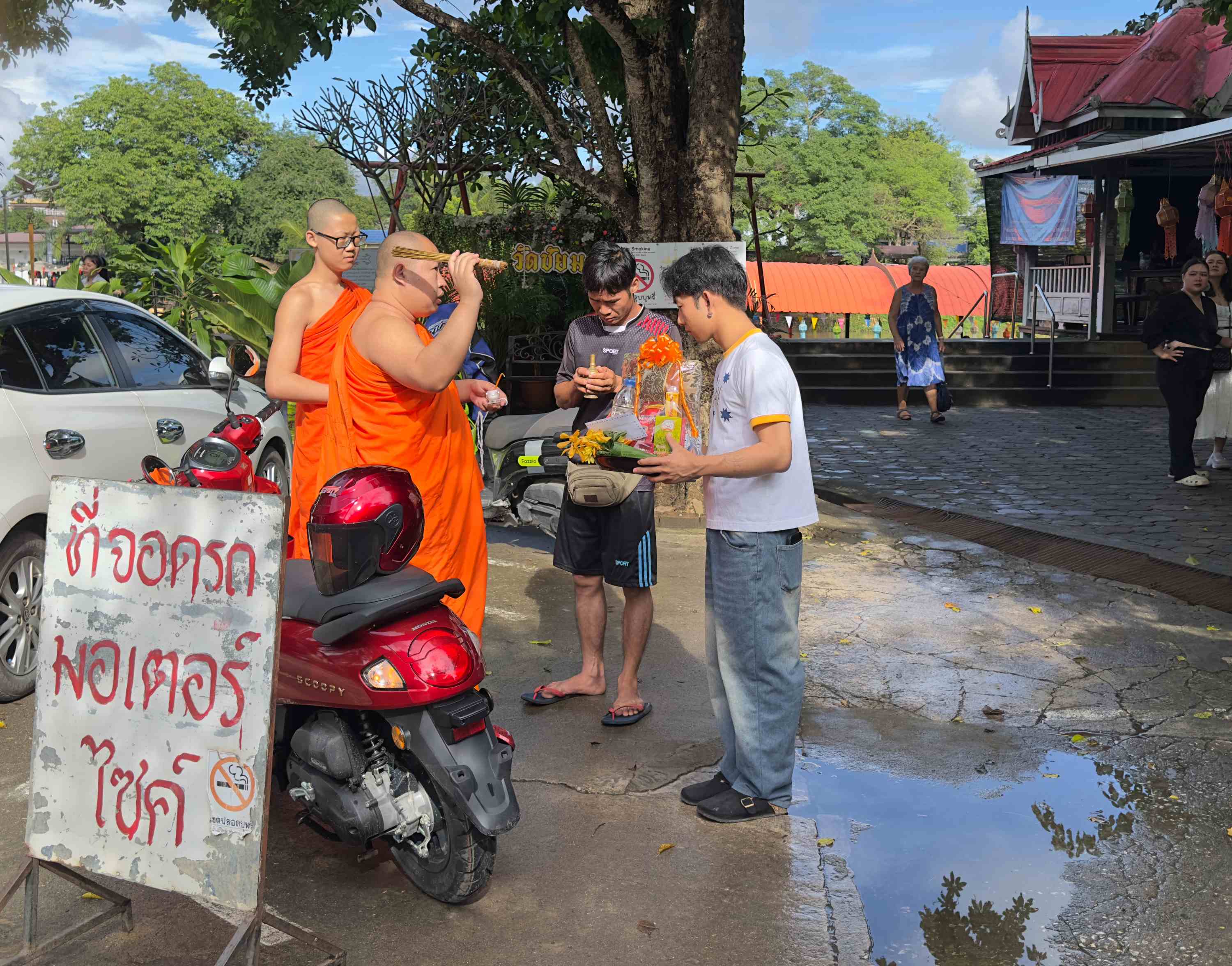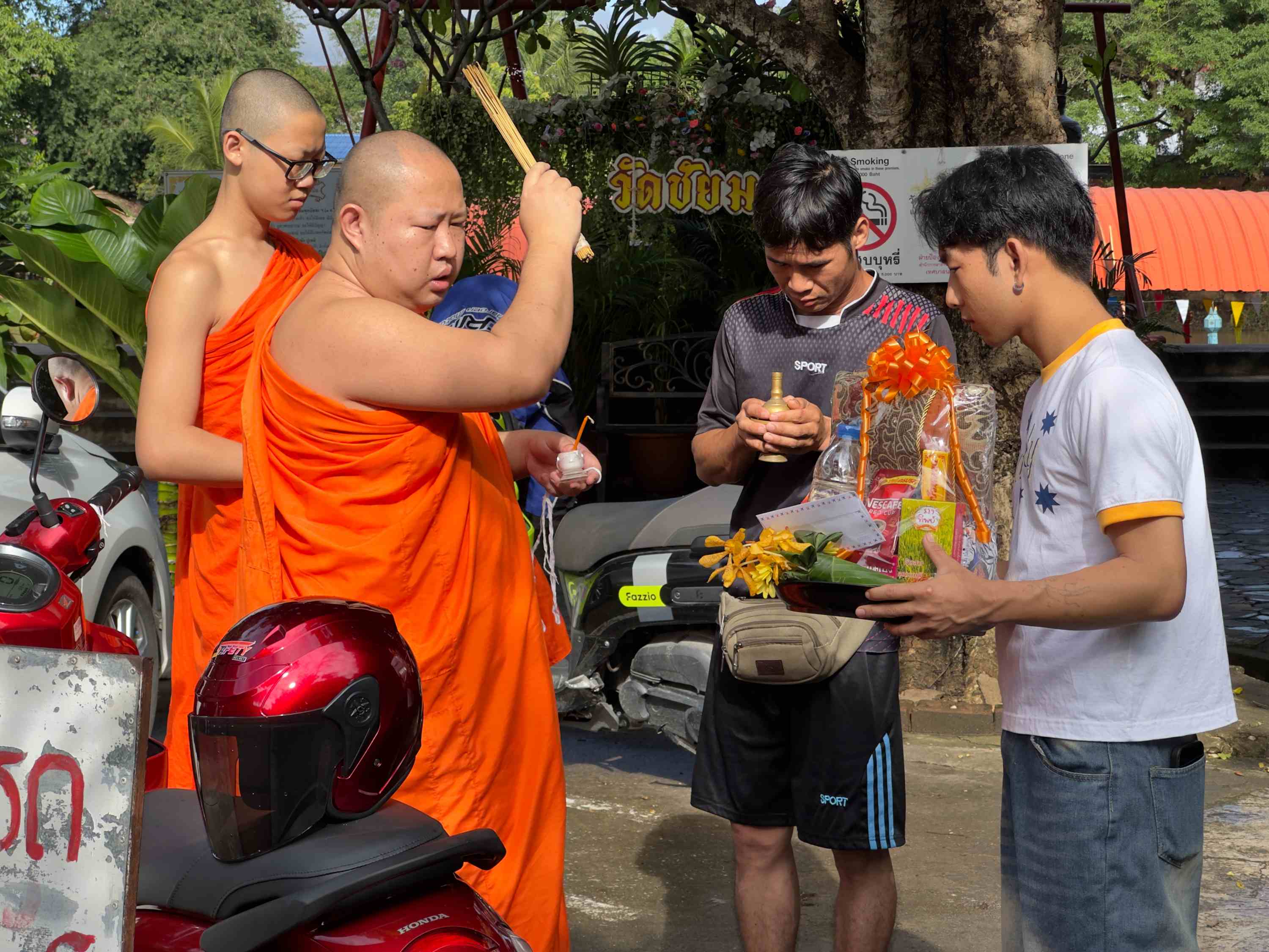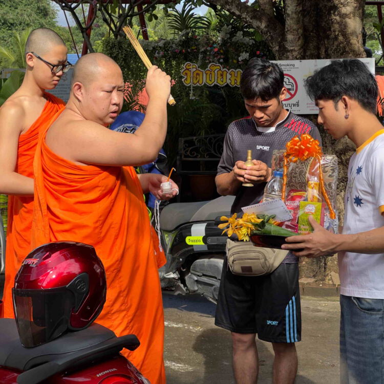 Ein paar Mal passieren wir ein unscheinbares altes Portal zu einem umfriedeten und eingewachsenen Grundstück. Es grenzt unmittelbar an unser Hotel an. Am letzten Tag biegen wir dort ein und finden uns auf einer Tempelanlage wieder. Alt und prächtig, wäre meine Kurzzusammenfassung. Das ganz besonders Erfreuliche für uns, dass wir keine weiteren westlichen Besucher sichten. Die anwesenden, einheimischen Menschen nutzen den Ort für ihre buddhistischen Rituale. Neugierig und in einigem Abstand sehen wir, wie sie nicht vor Statuen posieren, sondern dort in sich gehen und eine Art Fürbitte leisten. Zwei junge Männer lassen offensichtlich ihren Motorroller segnen, vermutlich in der Hoffnung auf sichere Verkehrsteilnahme. Der Präsentkorb, den sie anschließend dem diensthabenden Mönch überreichen, könnte günstiger ausfallen als der Abschluss einer Unfallversicherung - die nicht dafür bekannt ist, dass sie Unfälle verhindert.
