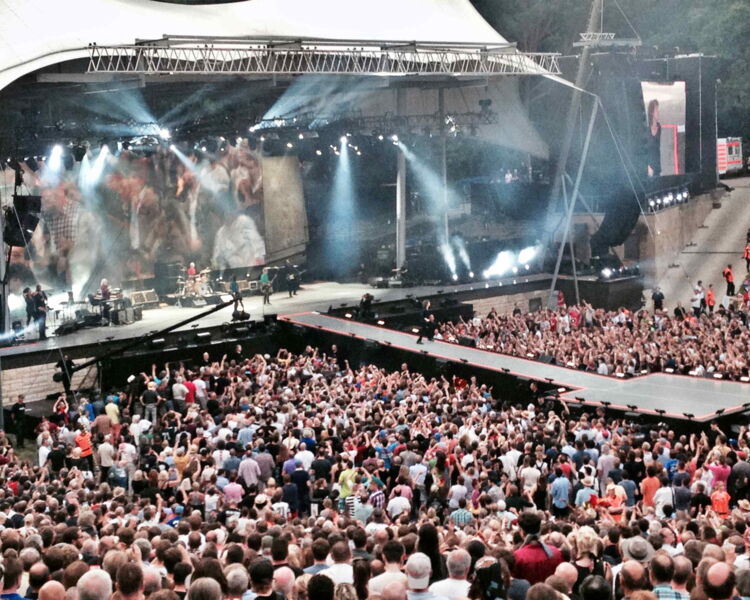 Pünktlich und im strömenden Regen erreichen wir das Olympiastadion. Am Eingang stapeln sich Berge von abgelegten Regenschirmen. Souverän ziehen wir unsere Plastiktüten hervor. Gute Vorbereitung ist eben alles. Der Regen stoppt. Von jetzt bis zum Ende des Konzerts wird kein Tropfen Wasser mehr vom Himmel fallen. Unser Sitzplatz befindet sich ausreichend weit unter dem Stadiondach. Die Plastiktüte befindet sich inzwischen im VIP-Beutel bei den anderen Kostbarkeiten. Die haben wir für einen abenteuerlichen Preis zusammen mit der Platzkarte erworben.