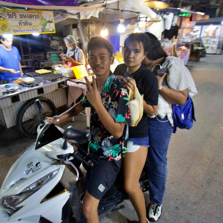 Wir vergessen auch nicht die junge wunderschöne Frau, die wir auf dem Nachtmarkt von Hua Hin beobachteten, wie sie mit ihrem kleinen Sohn scherzte und mit ihm vor dem eigenen Handy posierte, bis das Kind laut lachte. Wir saßen gegenüber an einem wackligen Restauranttisch und mussten mitlachen, so ansteckend waren die Zwei.